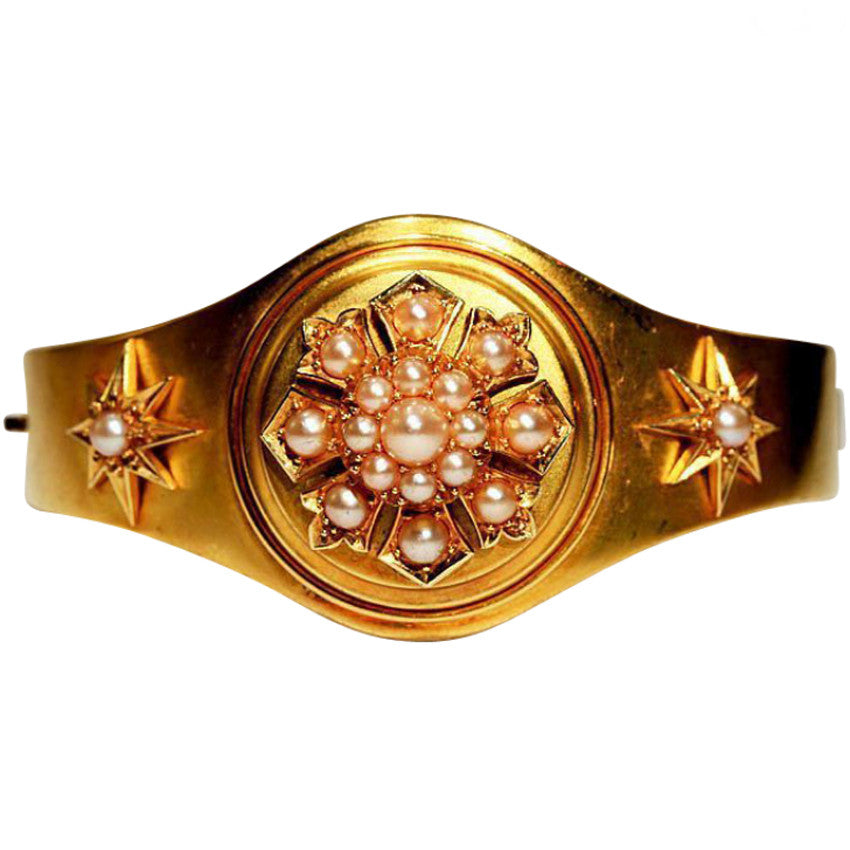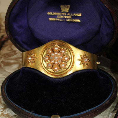 Amazing Antique Victorian 18k Gold Pink Pearl Bangle Bracelet in Original Fitted Box