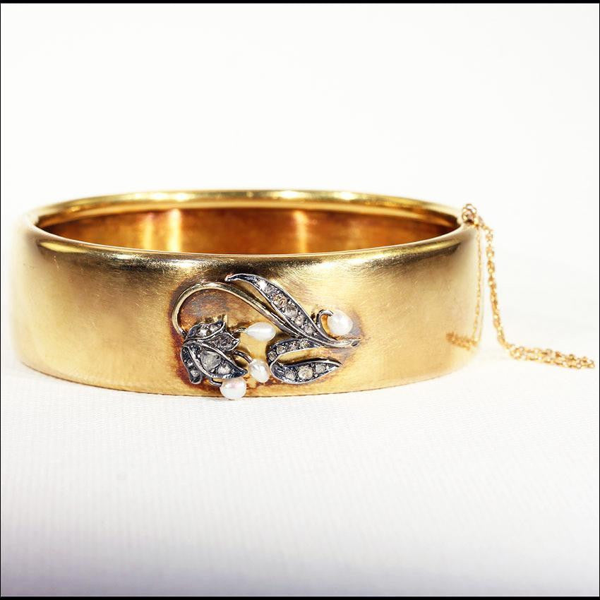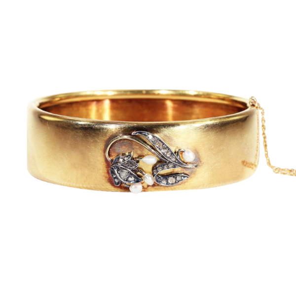 Antique Diamond Pearl Gold Bangle Bracelet with Lily of the Valley Flowers