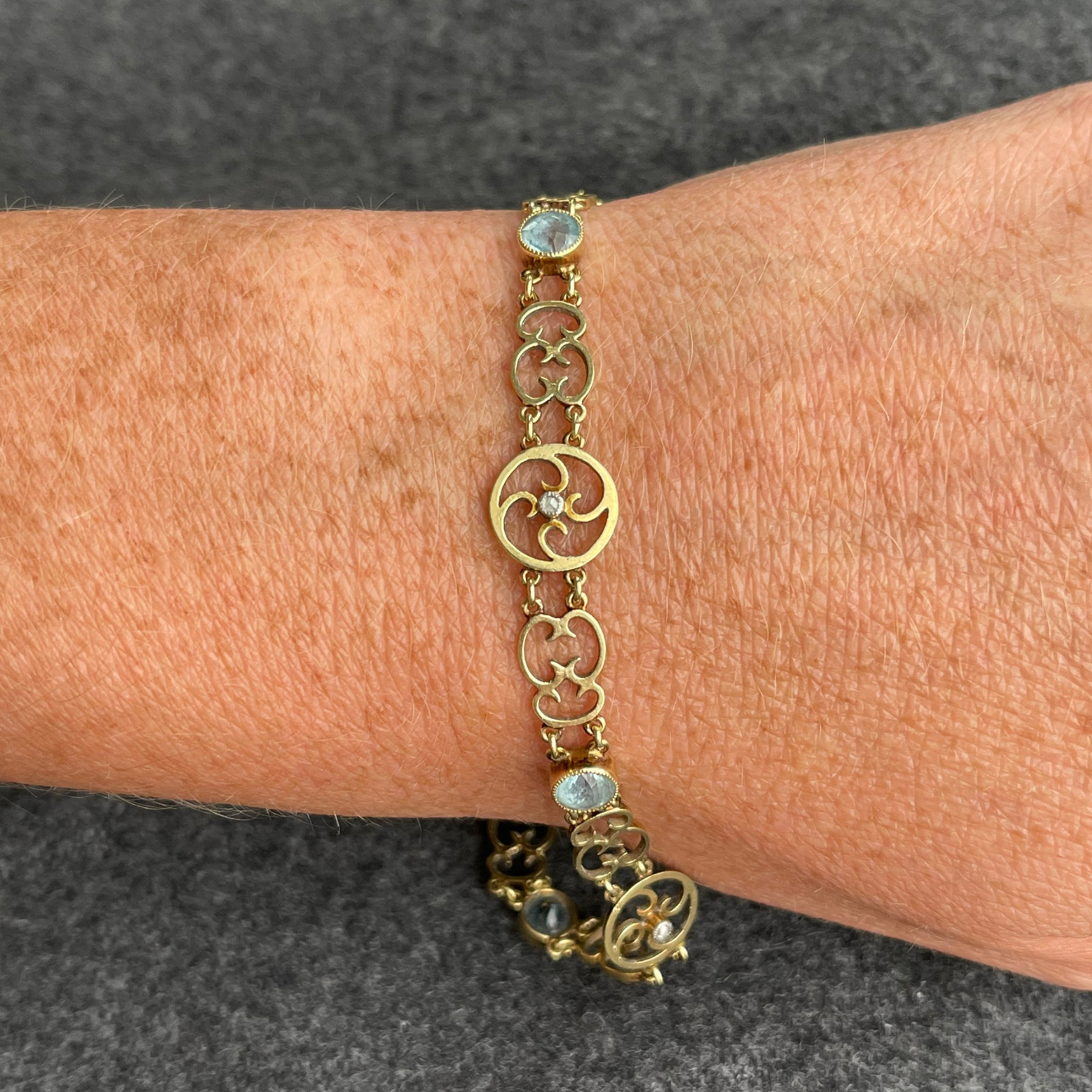 This stunning beauty was hand crafted in England in about 1910 during the Edwardian eye, when fashion turned towards the light and airy in style color and feel. This wonderful bracelet is set with four sparkling faceted round cut aquamarine gems that weigh 0.55 carats each (or 2.20 carats in total); it also contains four 1.7 mm diameter rose cut diamonds for a bit of added sparkle.