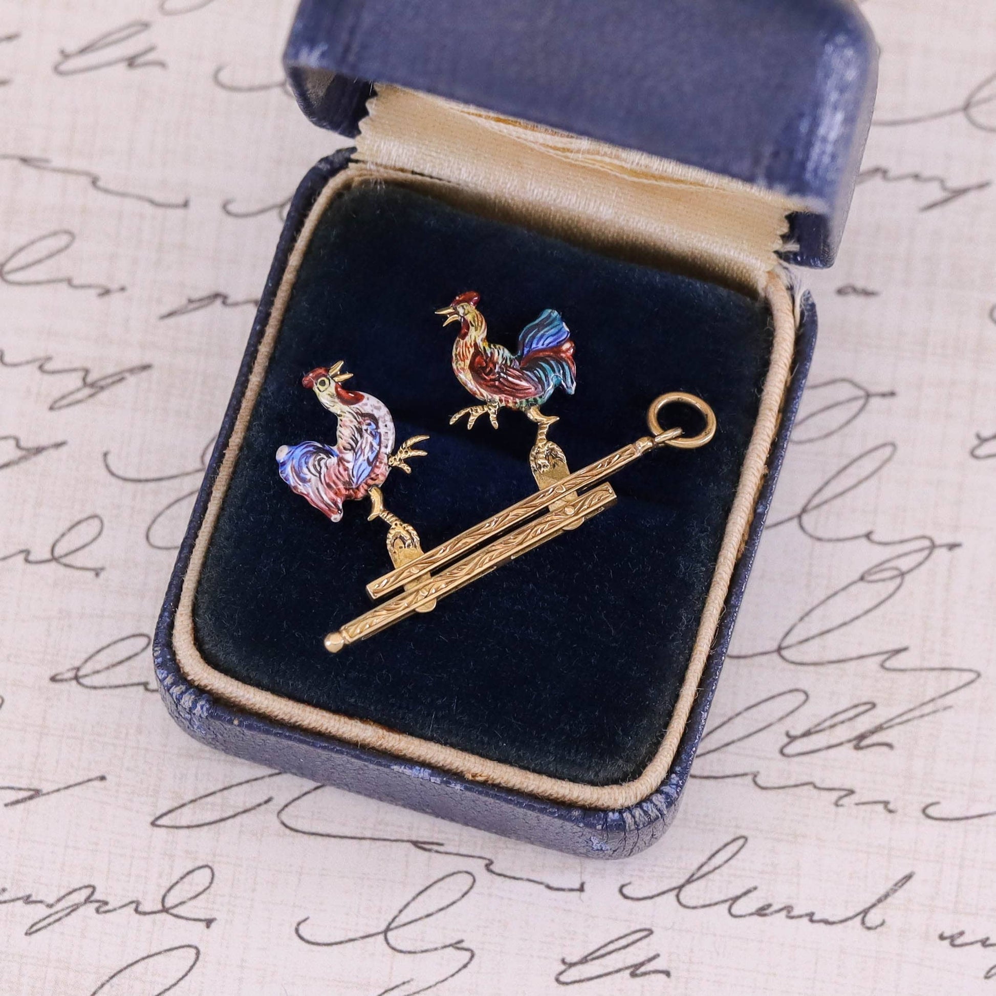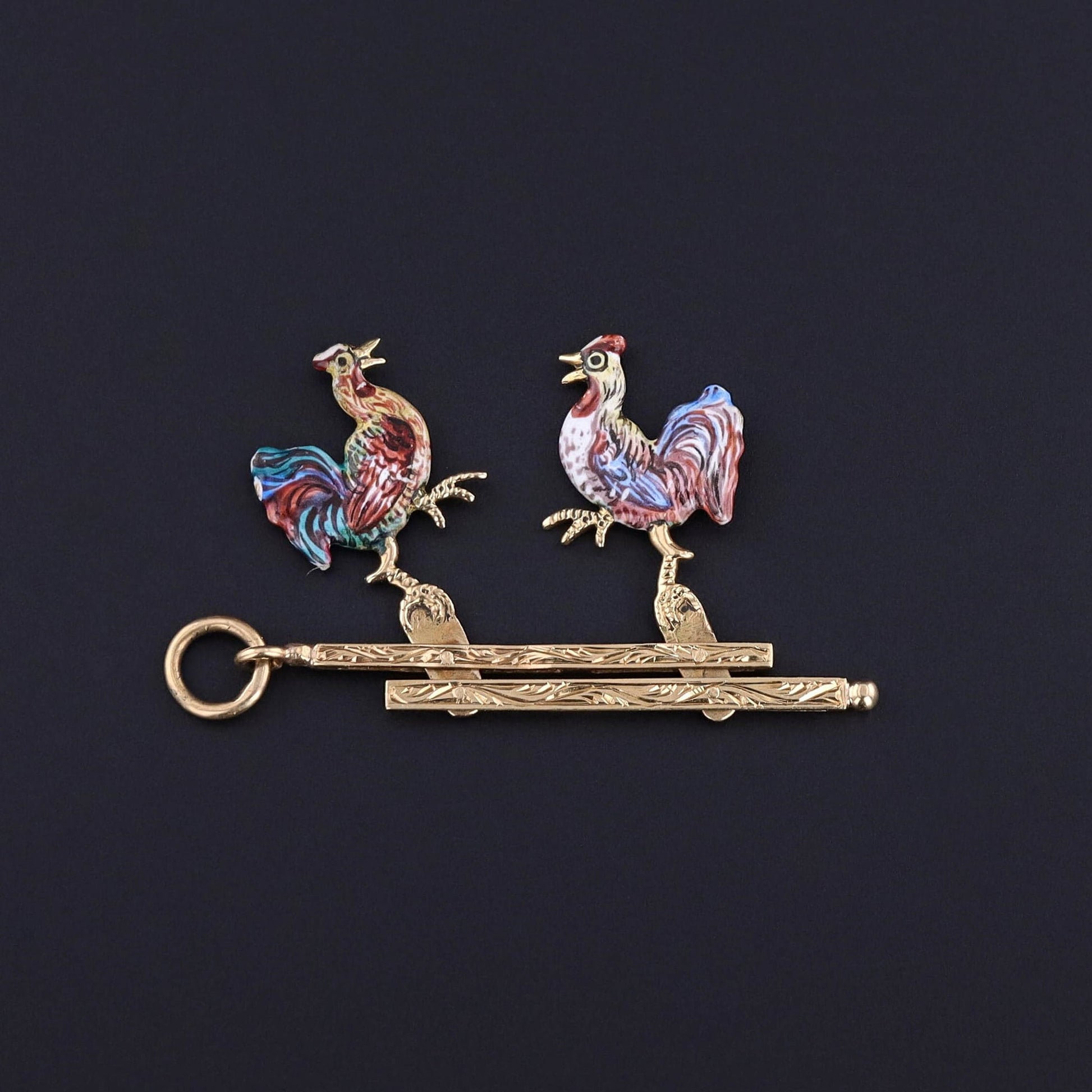 This antique 18k gold slide charm features two colorful enamel roosters that slide back and forth on a hand etched bar.