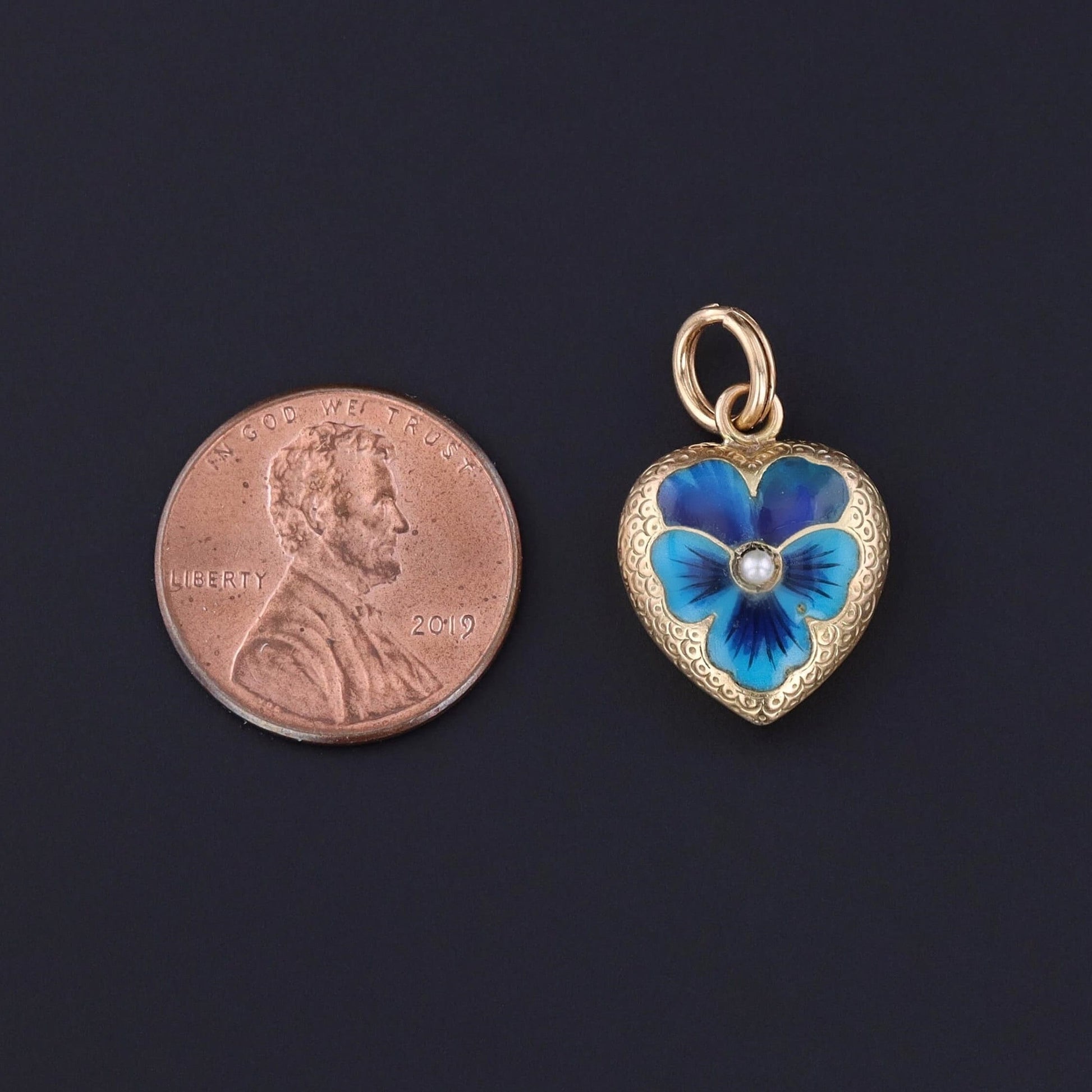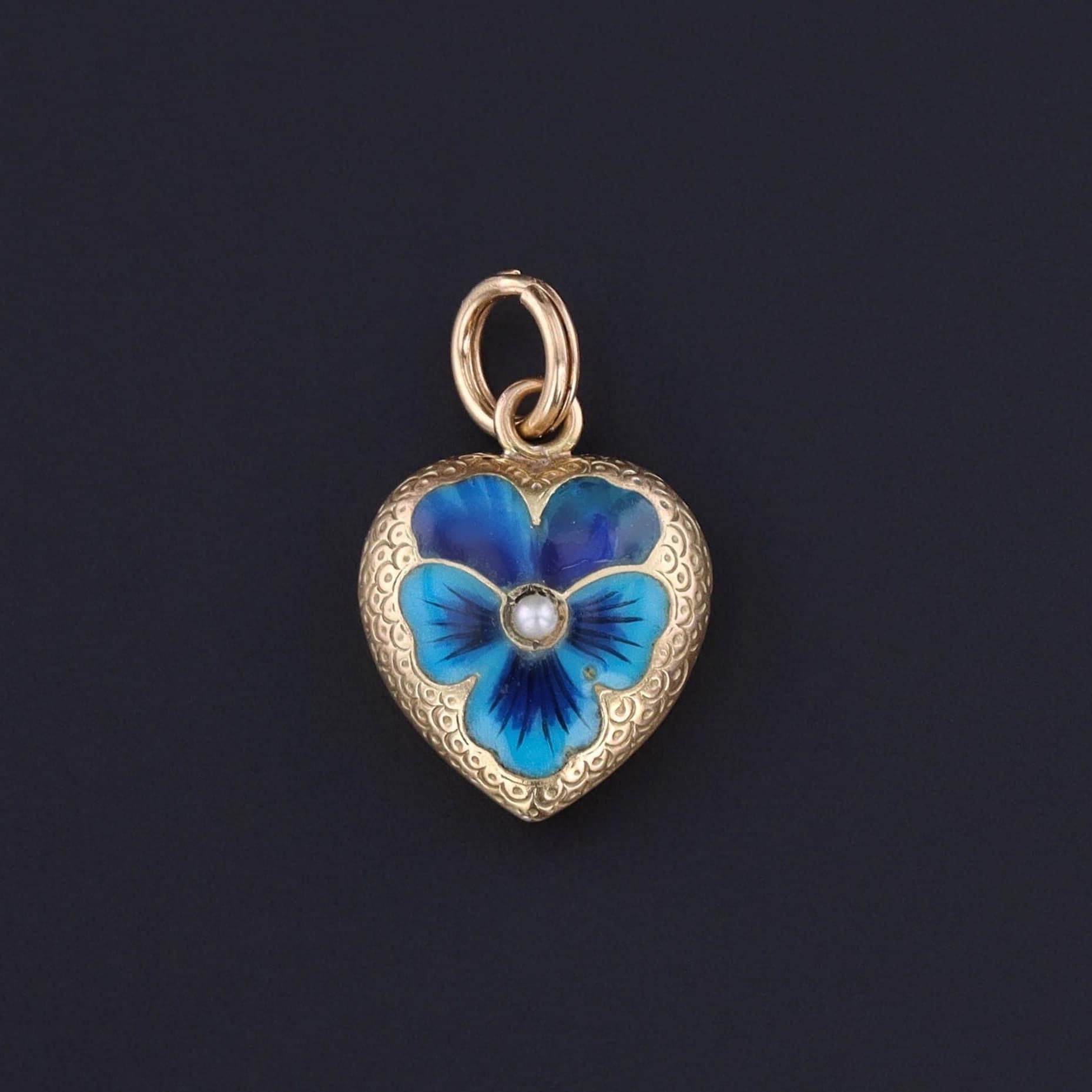 This antique 9ct gold pendant (circa 1890) features a heart adorned with a vibrant blue enamel and pearl pansy.