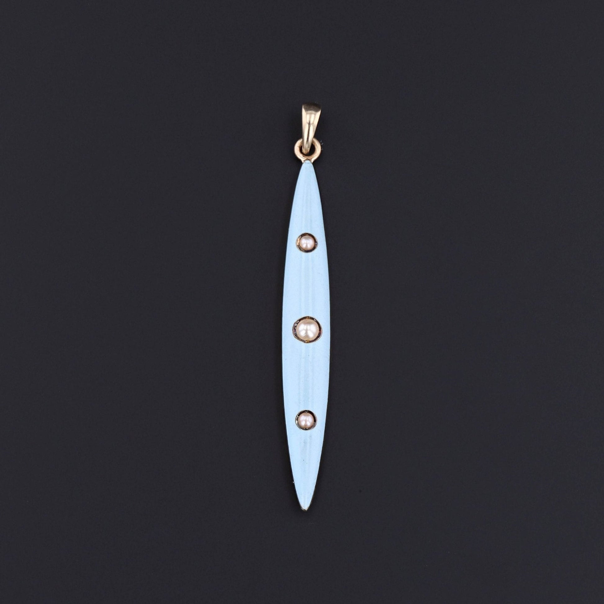 This gorgeous pendant features a spear of 14k gold with baby blue enamel and three tiny pearl accents. The piece was originally an antique lace pin (circa 1910) and it bears the maker's mark for Link & Angell of Newark, NJ.
