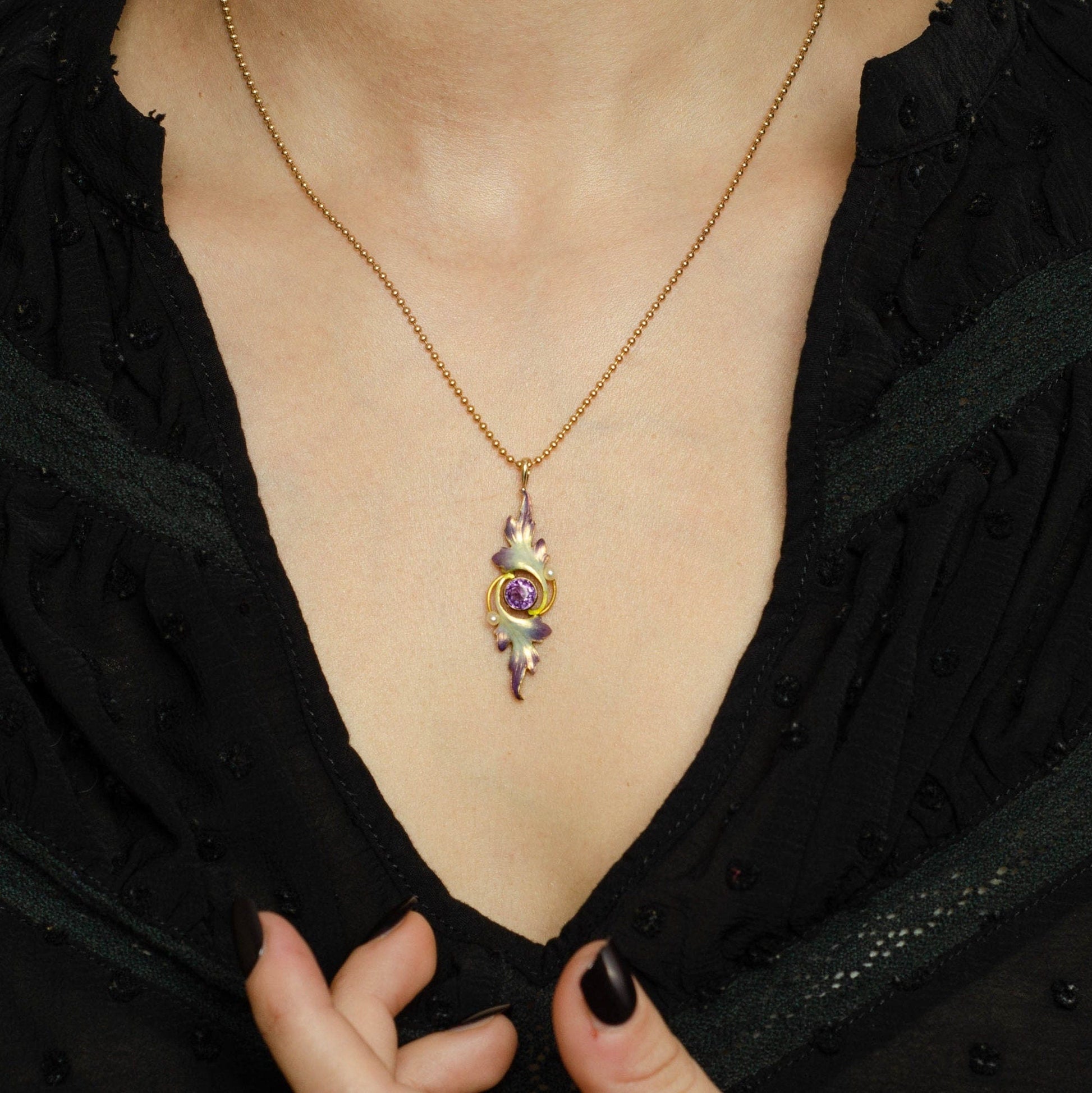 This playful pendant features a deep purple amethyst nestled in iridescent enamel leaves with pale green and lavender hues. Two lustrous pearl accents complete the look by adding a touch of sophisticated elegance to the piece.