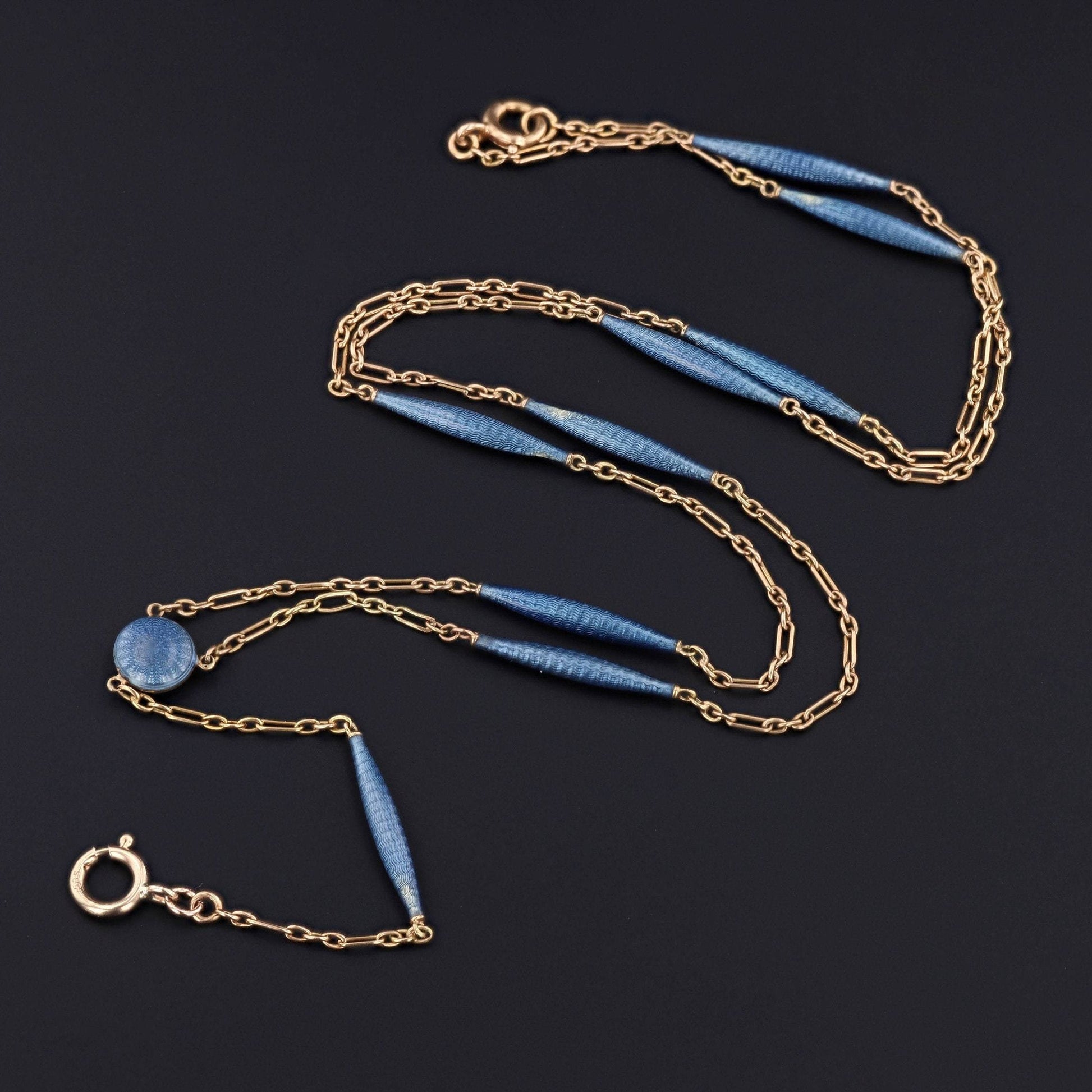 This antique 14k gold watch chain (circa 1910) features shimmering cornflower blue guilloche enamel accents and a lariat drop with a clasp - perfect for adding charms!