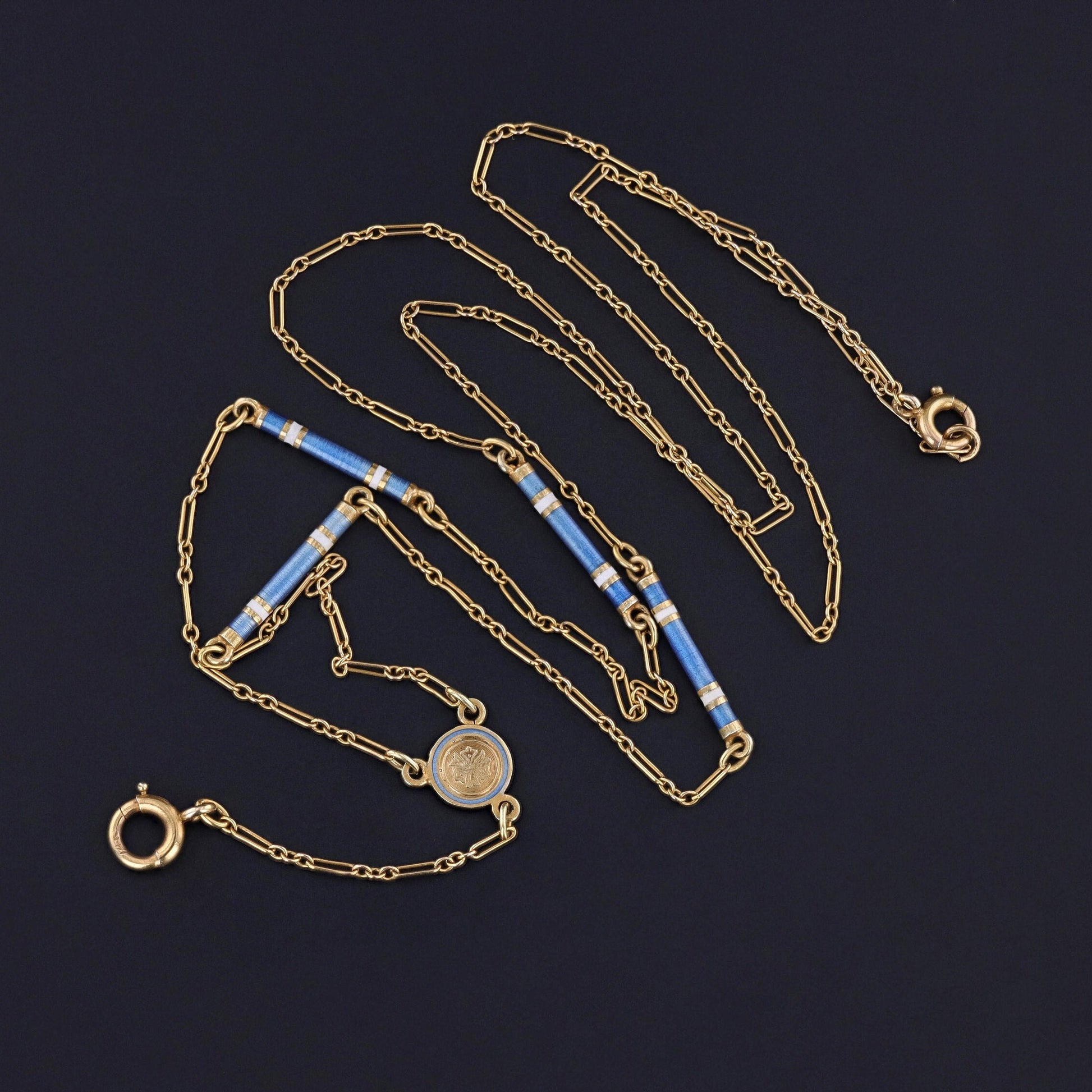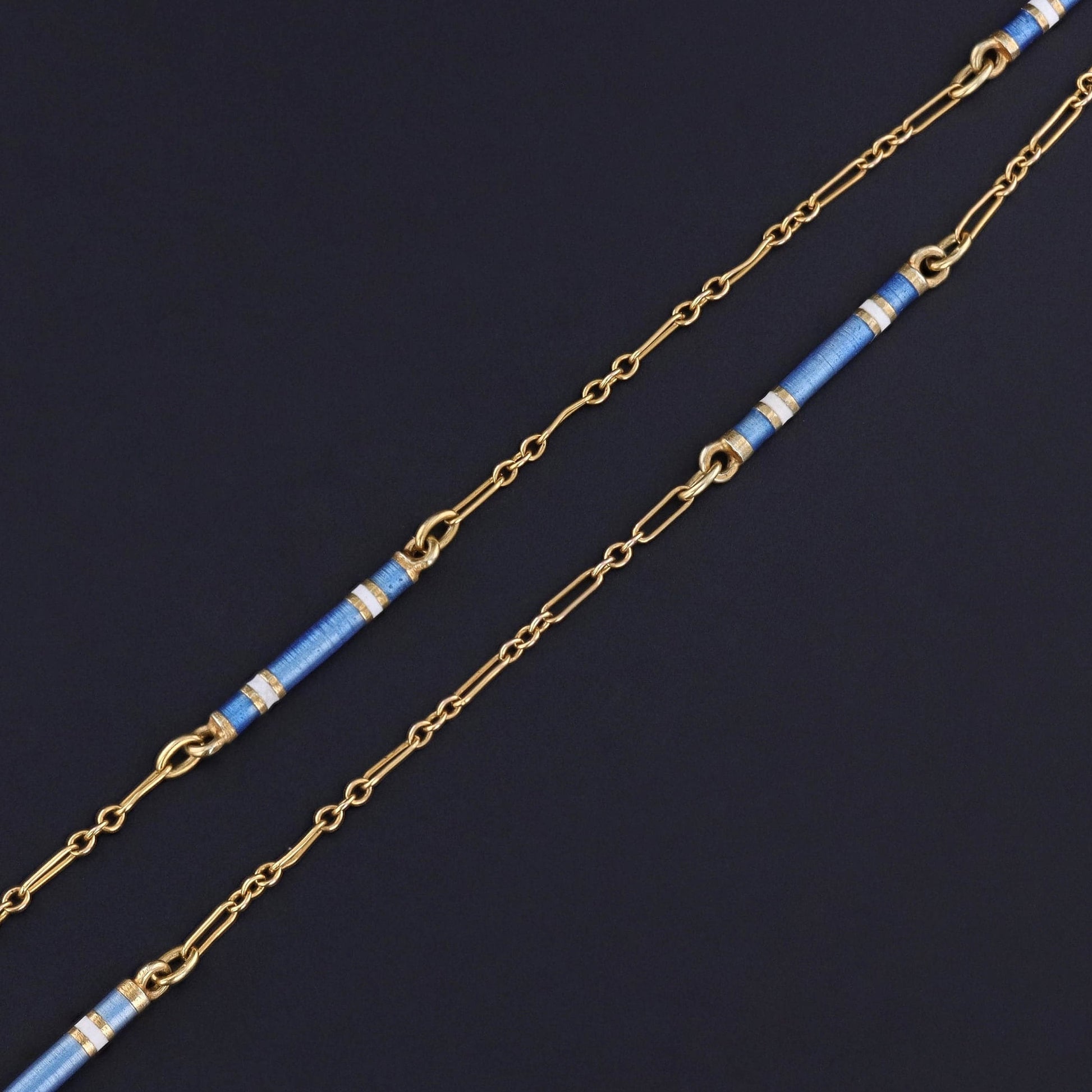 This antique watch chain necklace (circa 1900) features ornamental links adorned with white and blue enamel.
