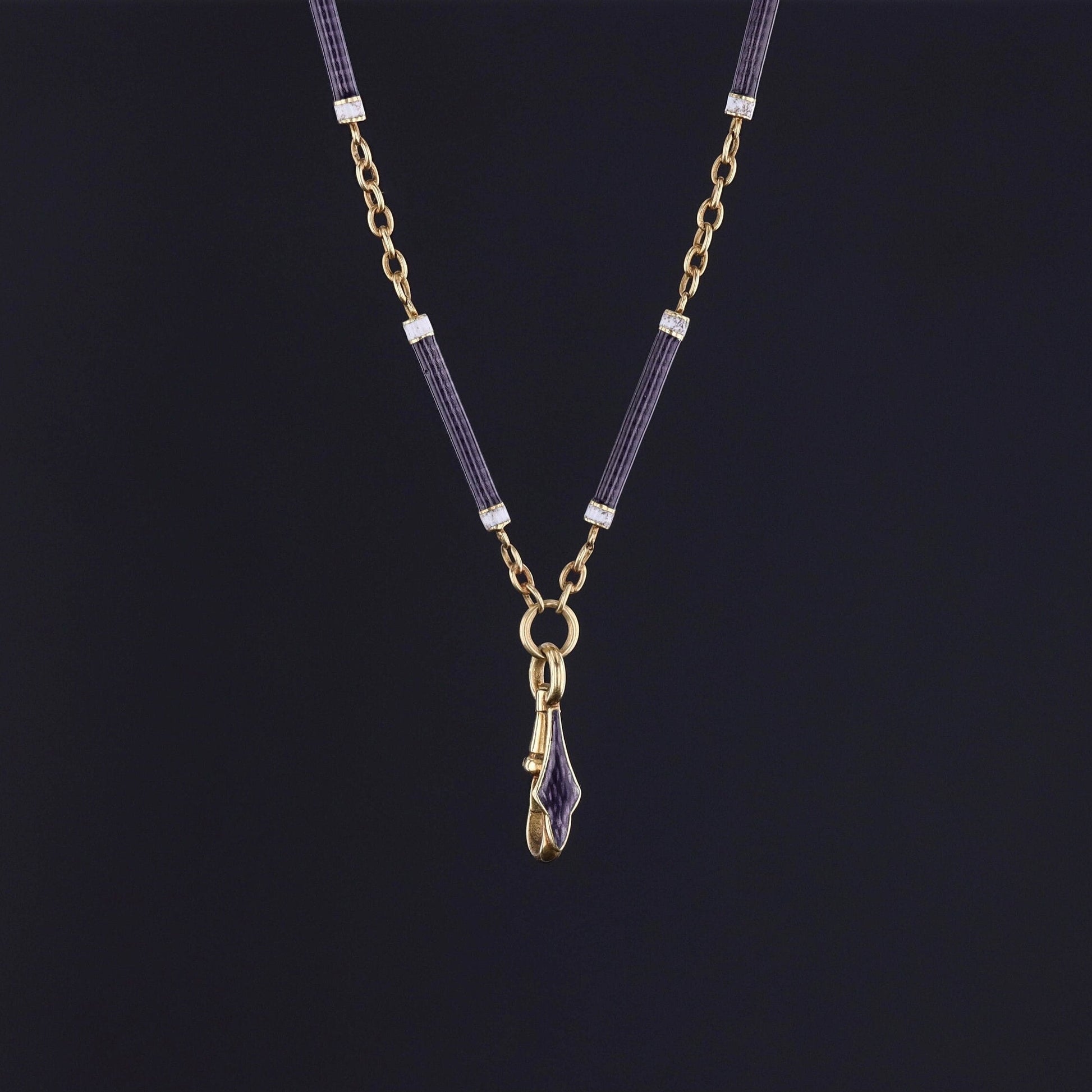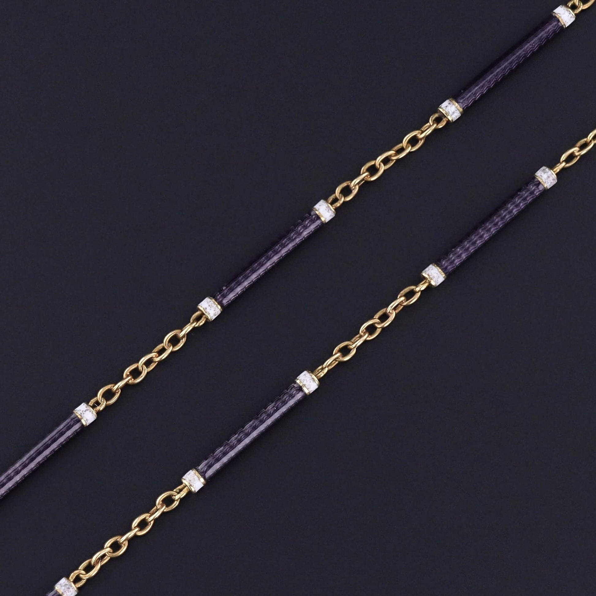 This antique 18k gold watch chain (circa 1890) features deep purple guilloche enamel with white enamel accents.