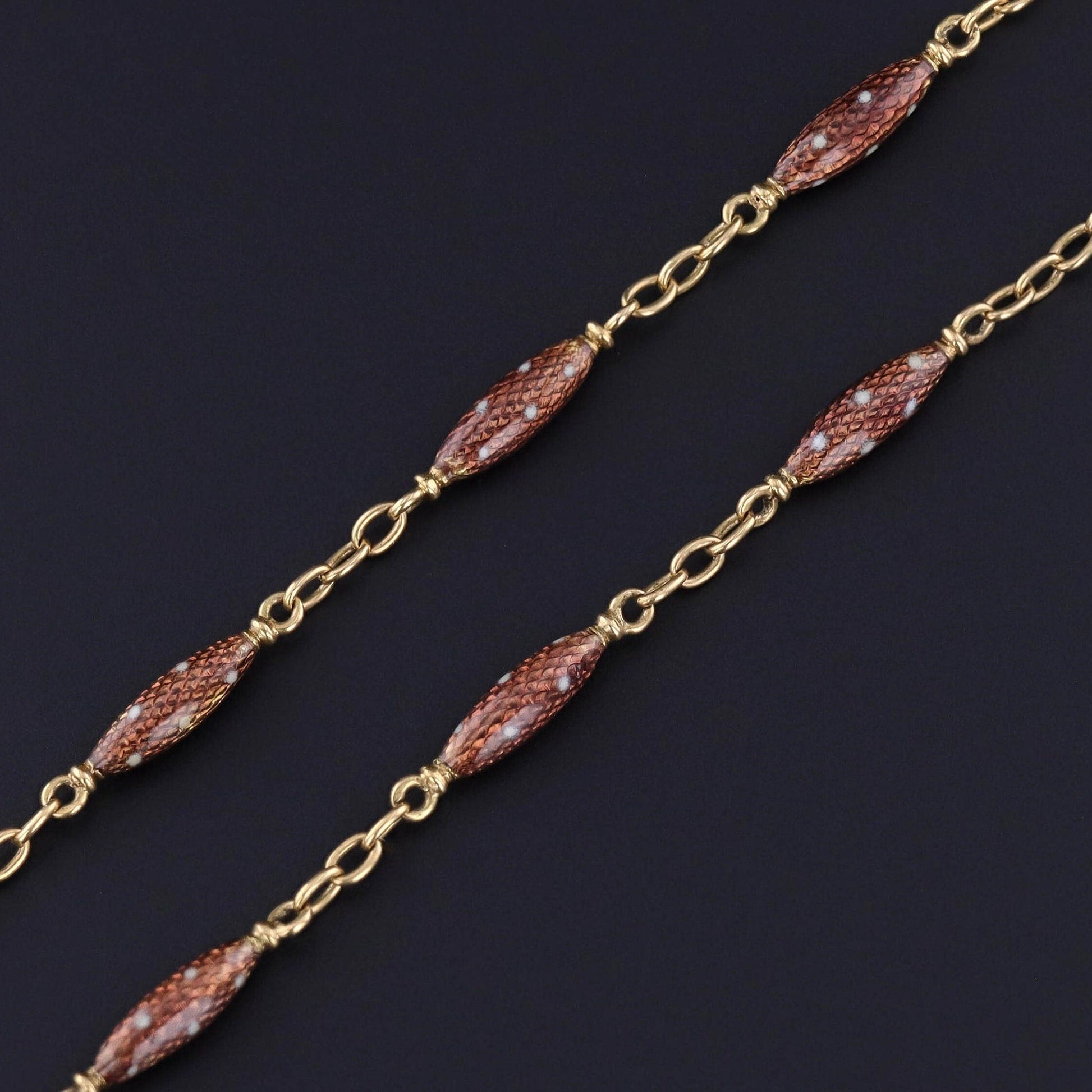 This 18k gold watch chain (circa 1890) features links of polka dotted copper hued enamel.