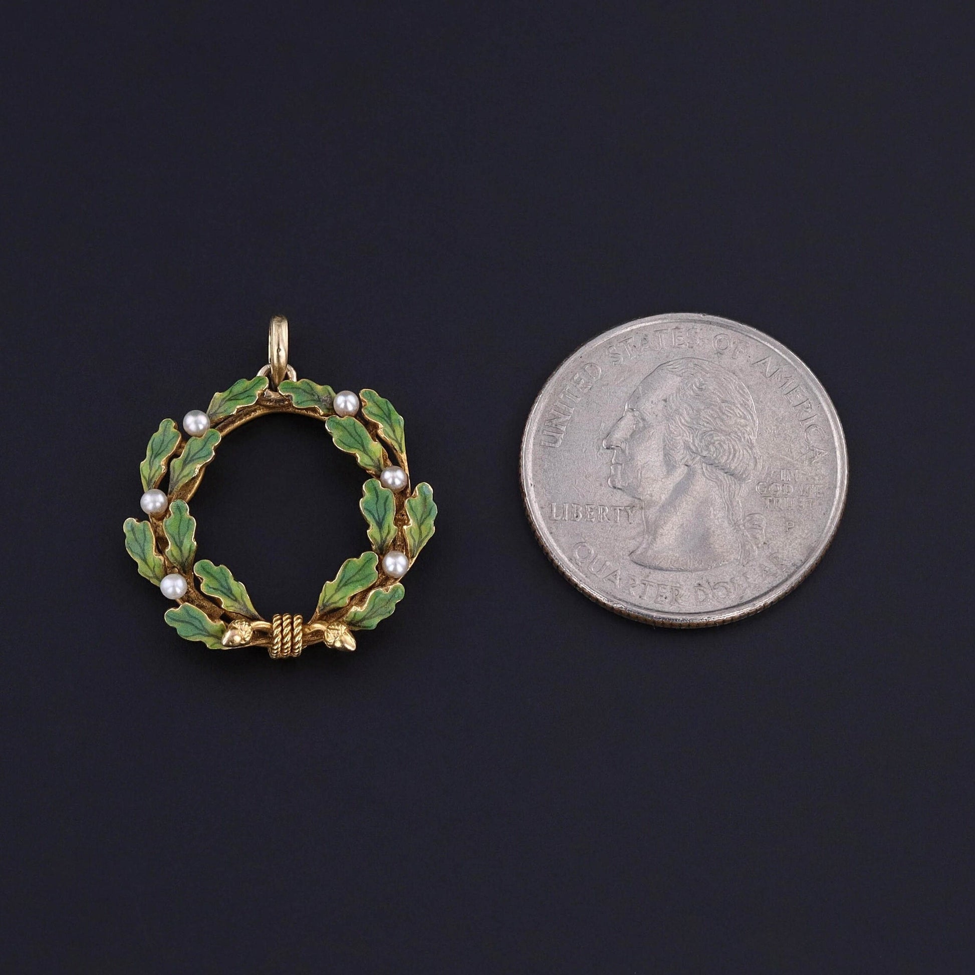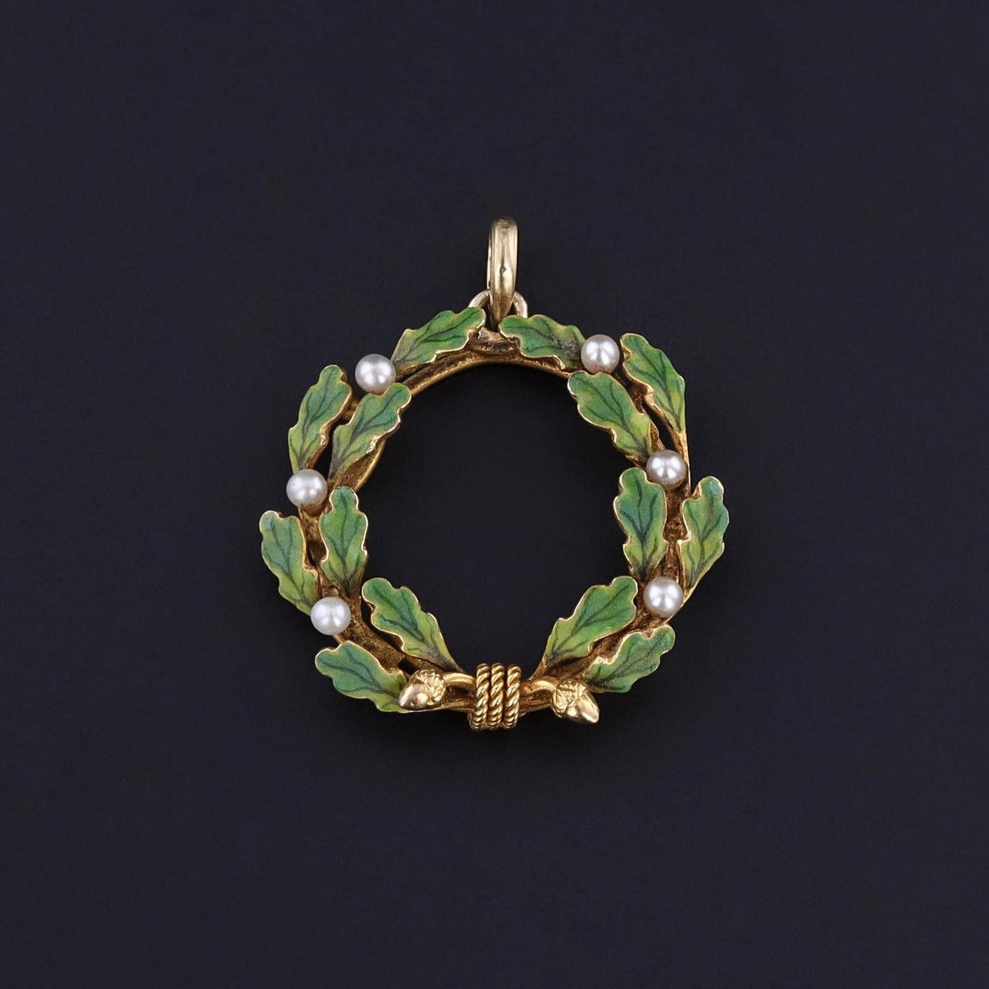 This pendant features an oak and acorn wreath of 14k gold, adorned in green enamel and accented with pearls. It was originally an antique brooch (circa 1910) that our jeweler transformed by removing the pin findings and adding a gold bail.