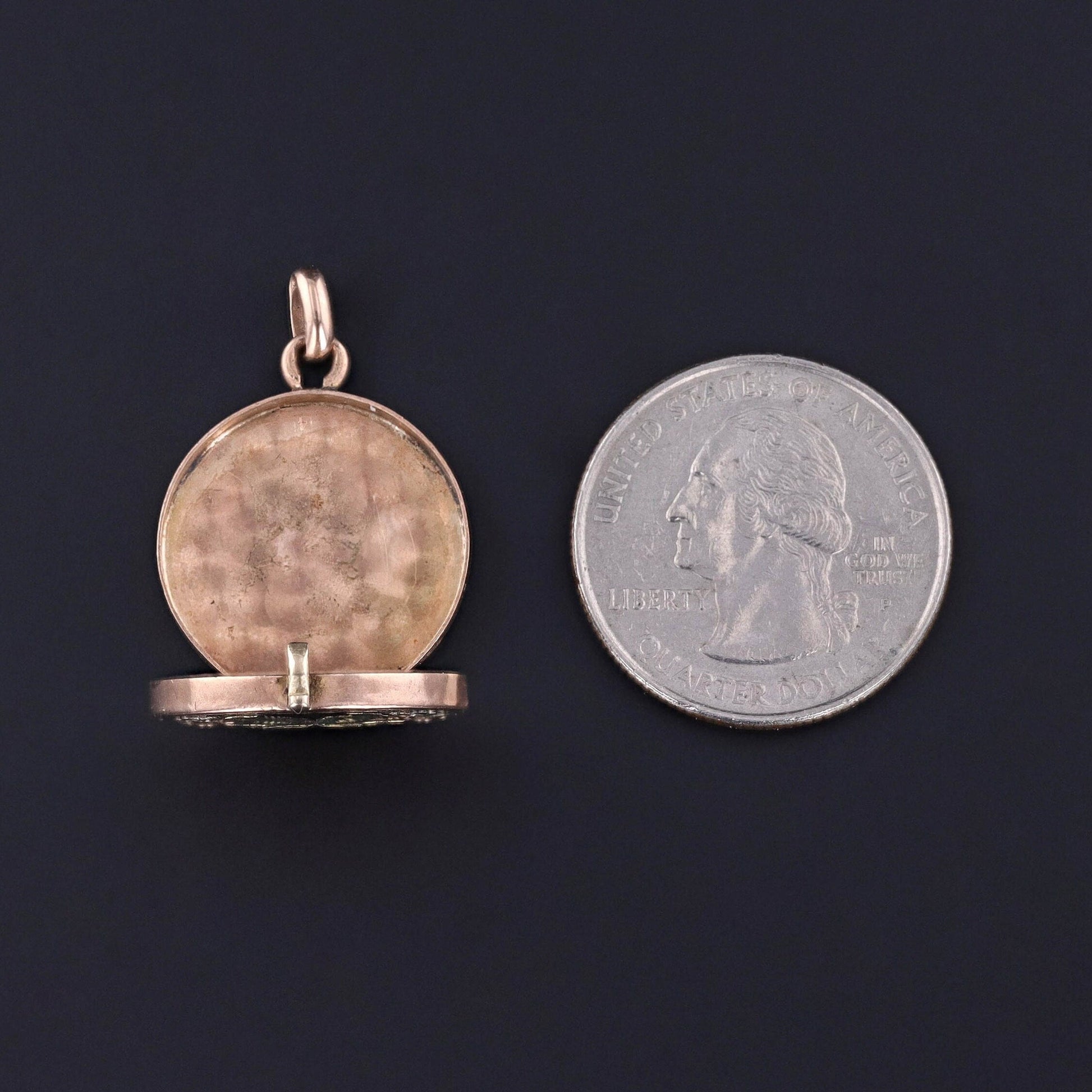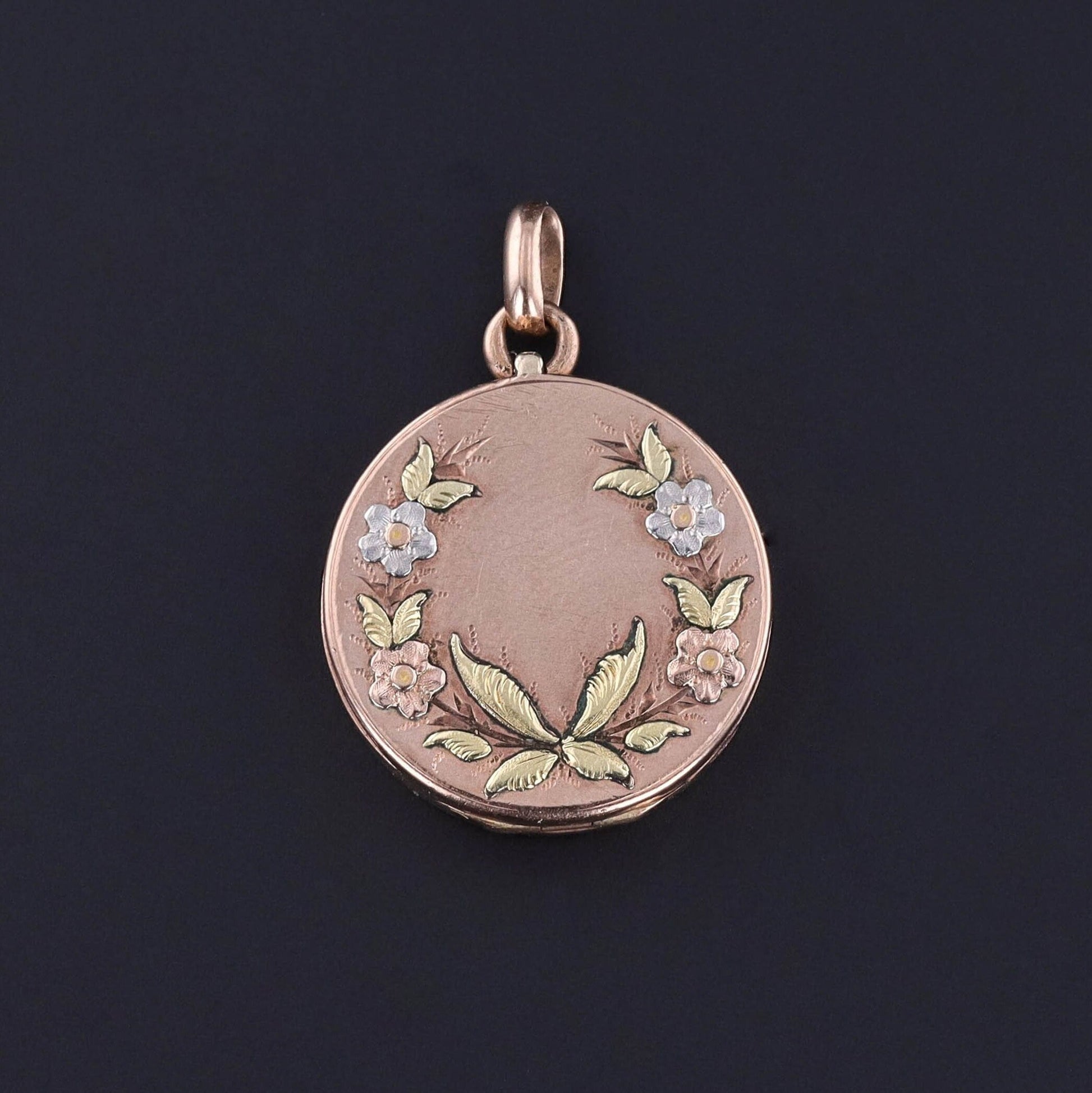 This antique 9ct gold locket (circa 1890) is pale rose gold with platinum, rose, and yellow gold accents on its front.