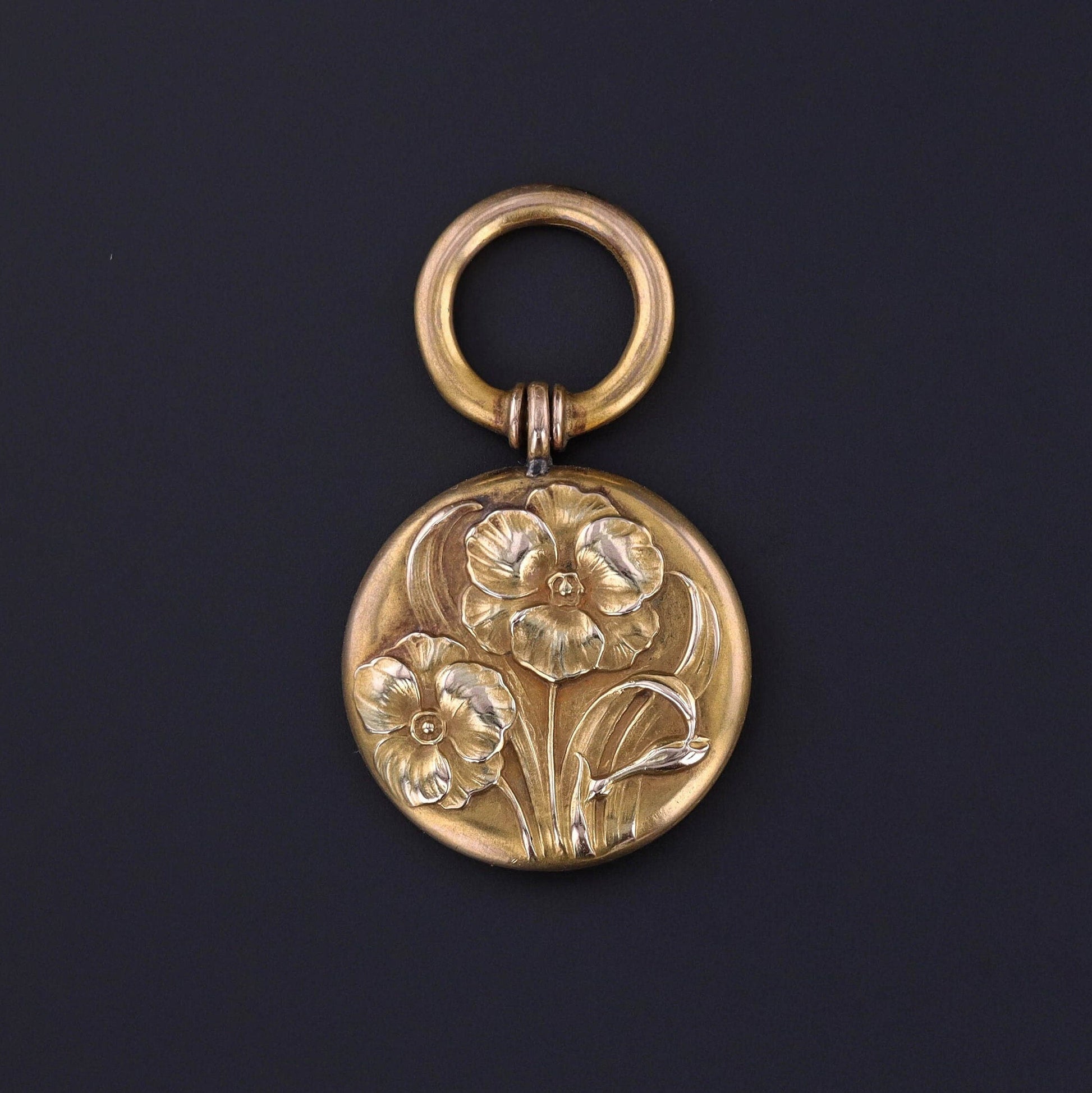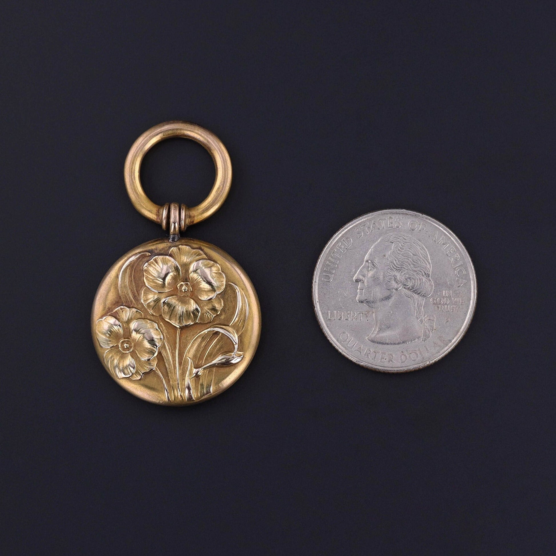 Antique Floral Pendant: A floral treasure from the turn of the 20th century. This 10k gold pendant is embossed with a floral design on the front and a large bolt ring for dramatic effect. The reverse bears the inscription 'F. R. W. Beunos Ayres May 1904'.