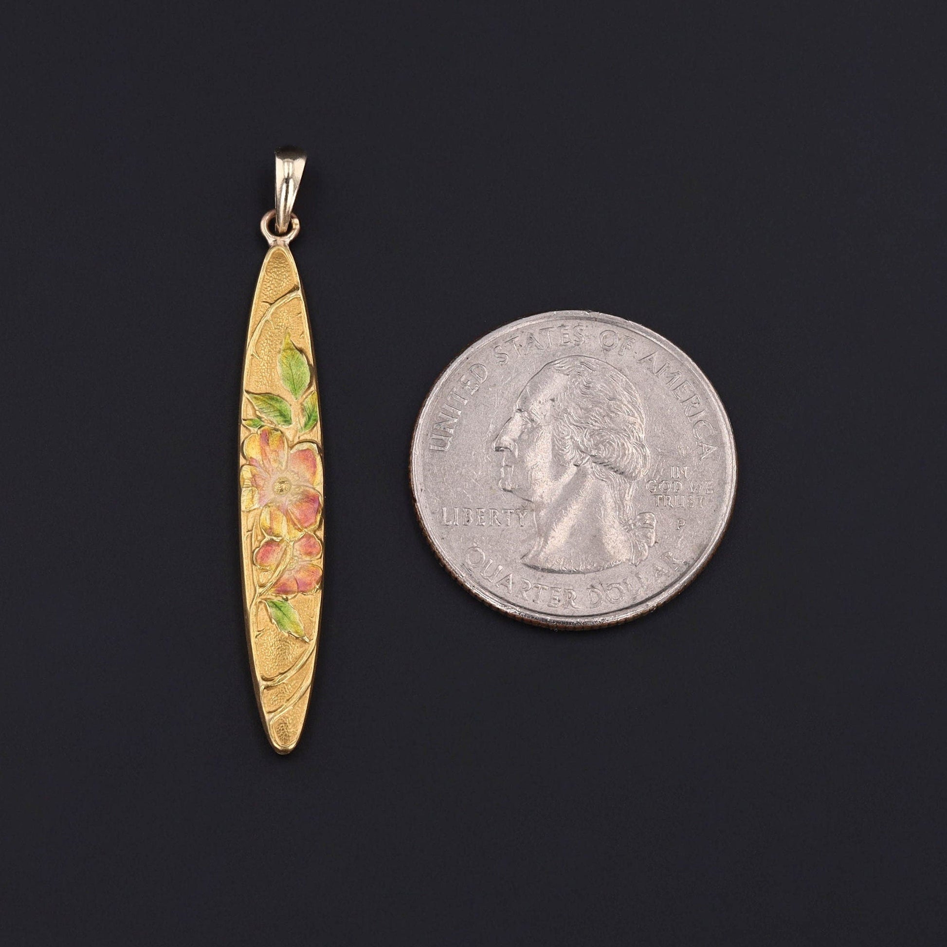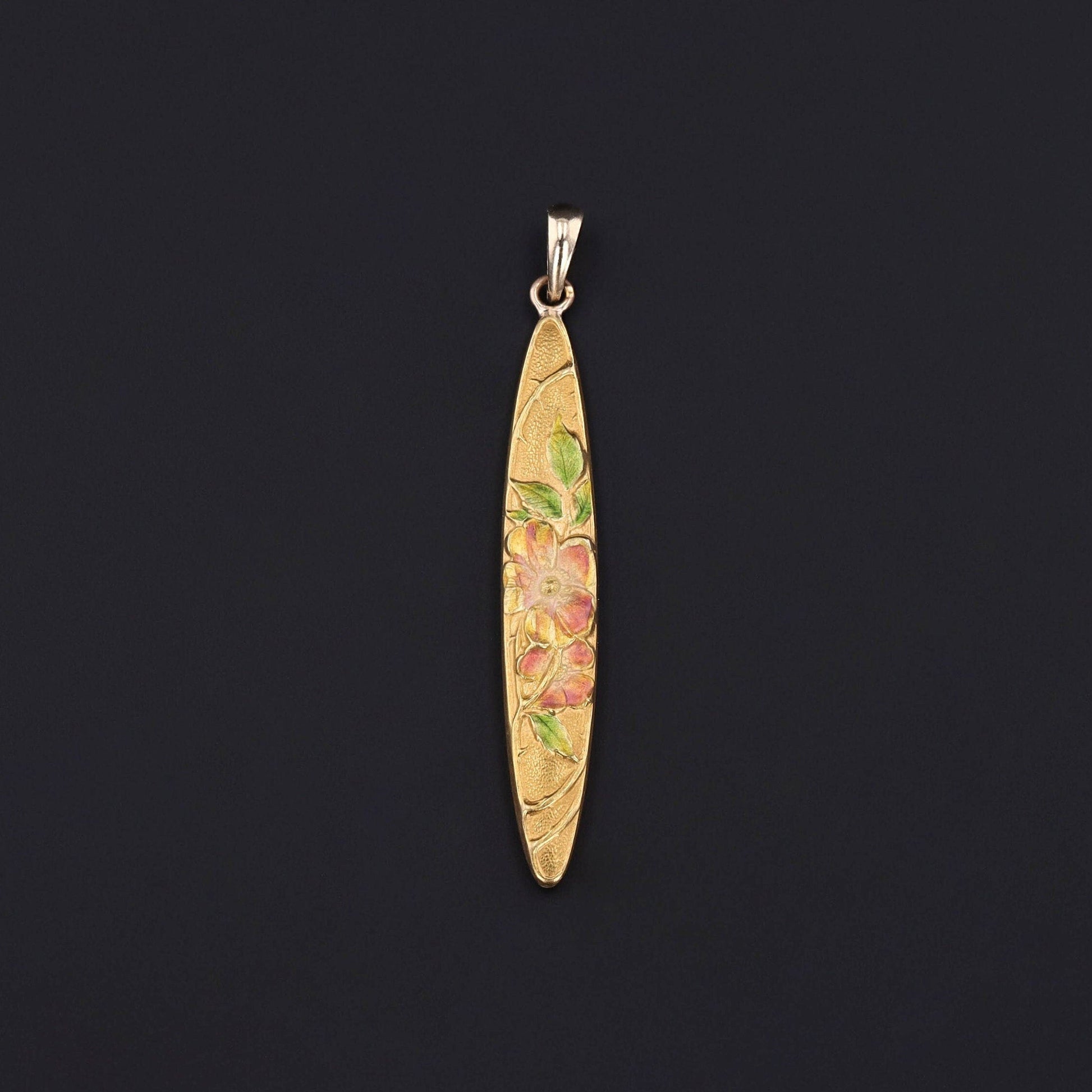 This pendant was converted from an antique bar pin (circa 1910) by removing the pin findings and adding a gold bail. It is 14k gold and ornamented with iridescent enamel flowers.