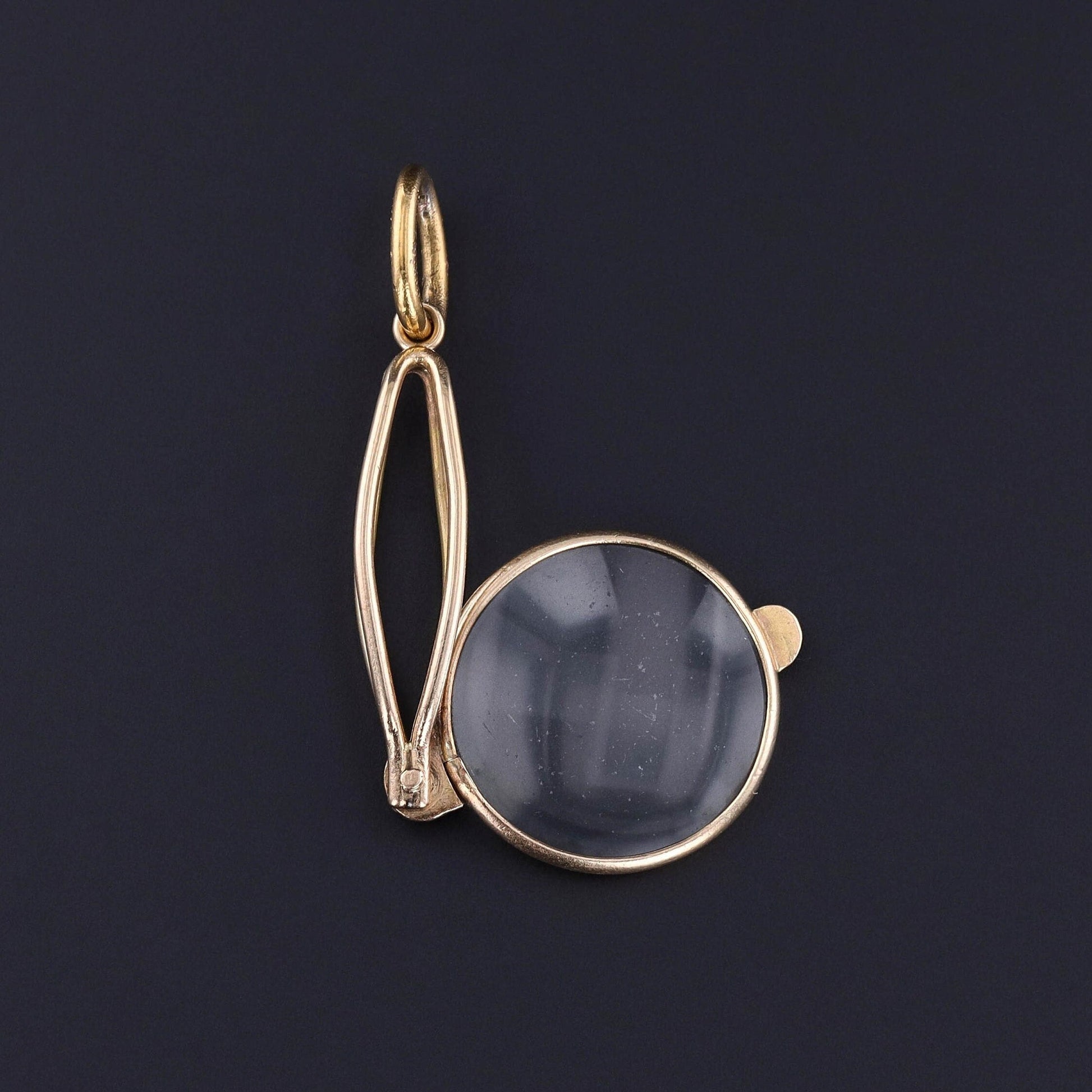 This antique pendant (circa 1910-1920) features a magnifying glass in 14k gold that swivels open.