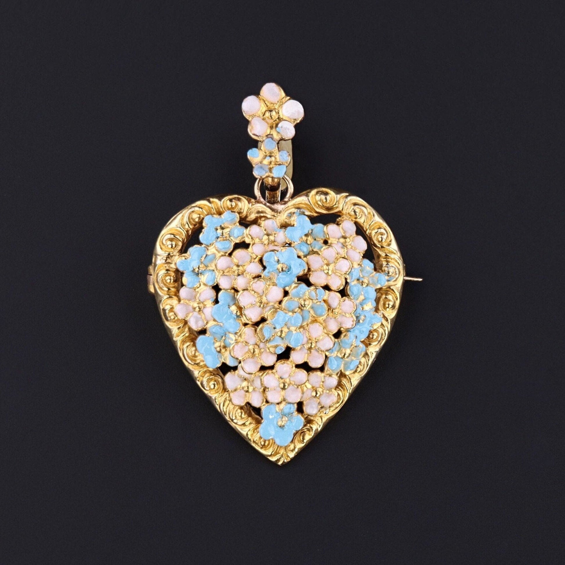 This antique piece by Krementz & Co. dates to the early 1900s. It features a heart and matching bail with vibrant blue and white enamel forget-me-not flowers. The bail is removable and the heart can be worn as either a pendant or brooch.