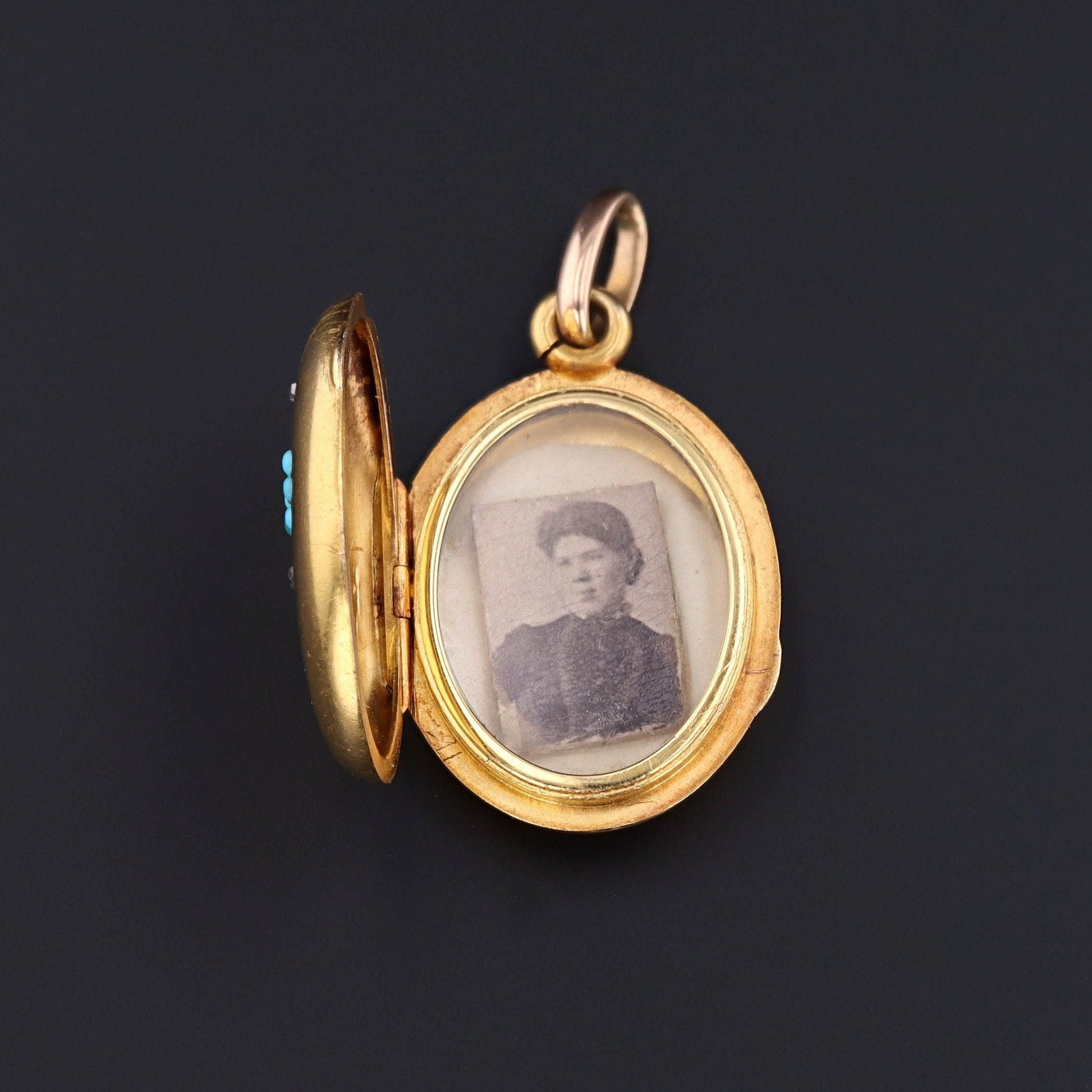 This lovely Victorian locket (circa 1880-1900) is accented with turquoise and diamond forget-me-not flowers and black enamel stems. The locket is 14k gold (unmarked, but acid tested).