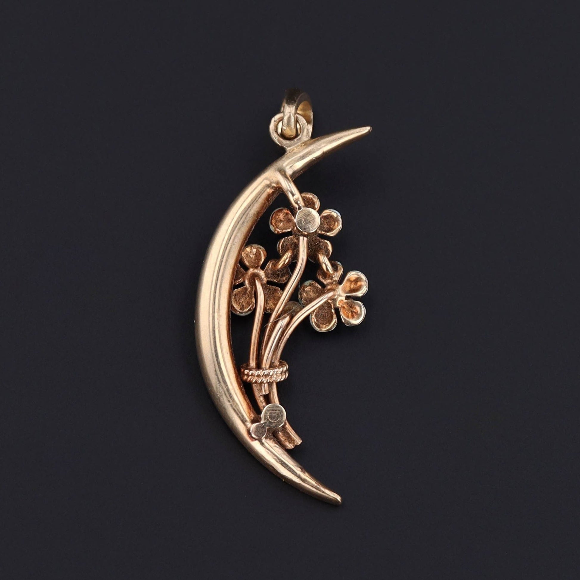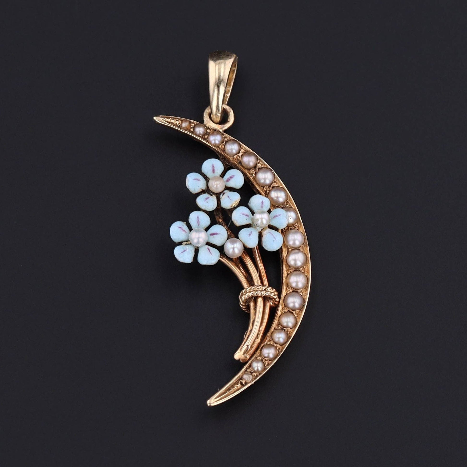 Antique Forget-me-not Pendant | 14k Gold, Enamel & Pearl Crescent Pendant