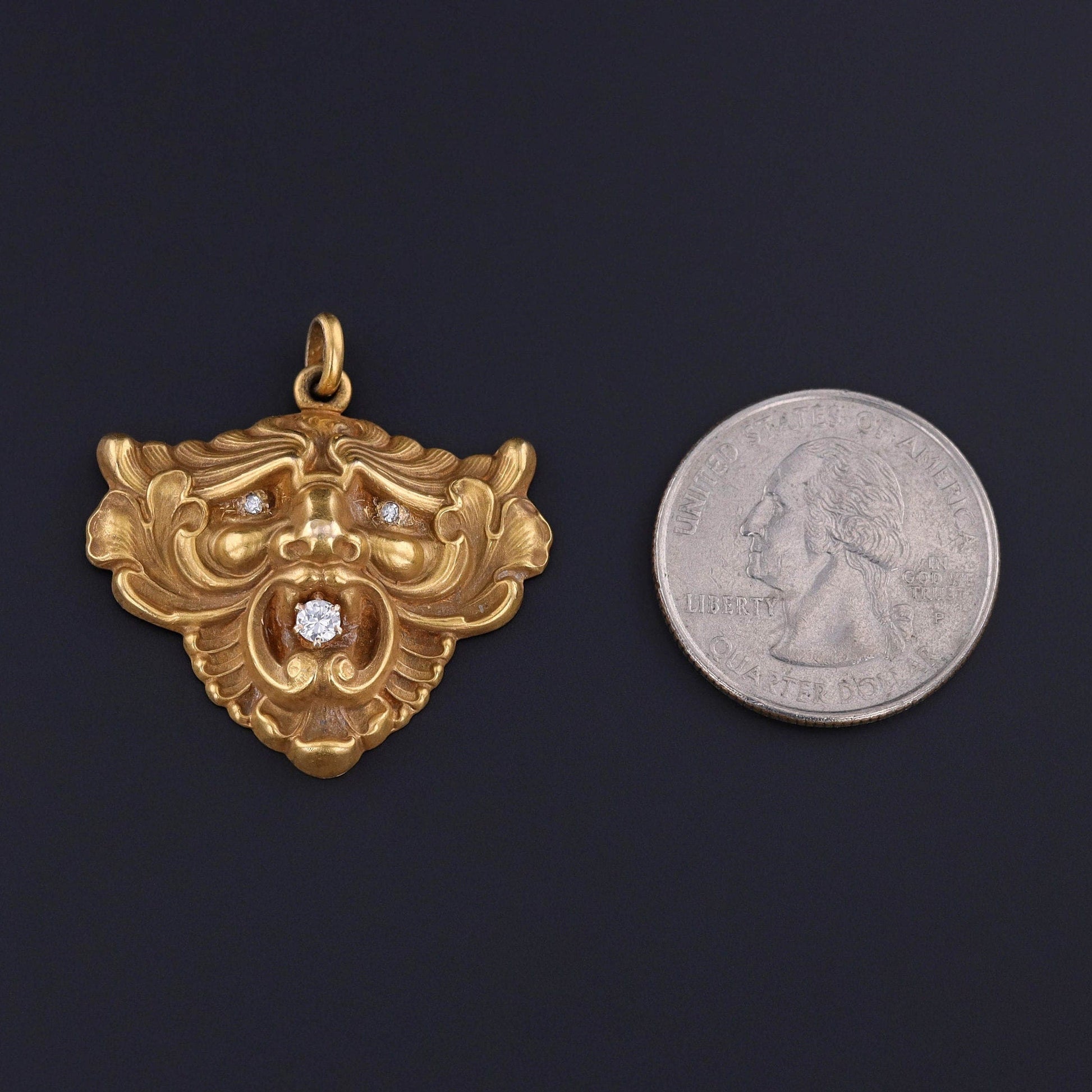 This antique pendant (circa 1900) features a gargoyle of 10k gold with single cut diamond eyes and an old mine cut diamond in its jaws.