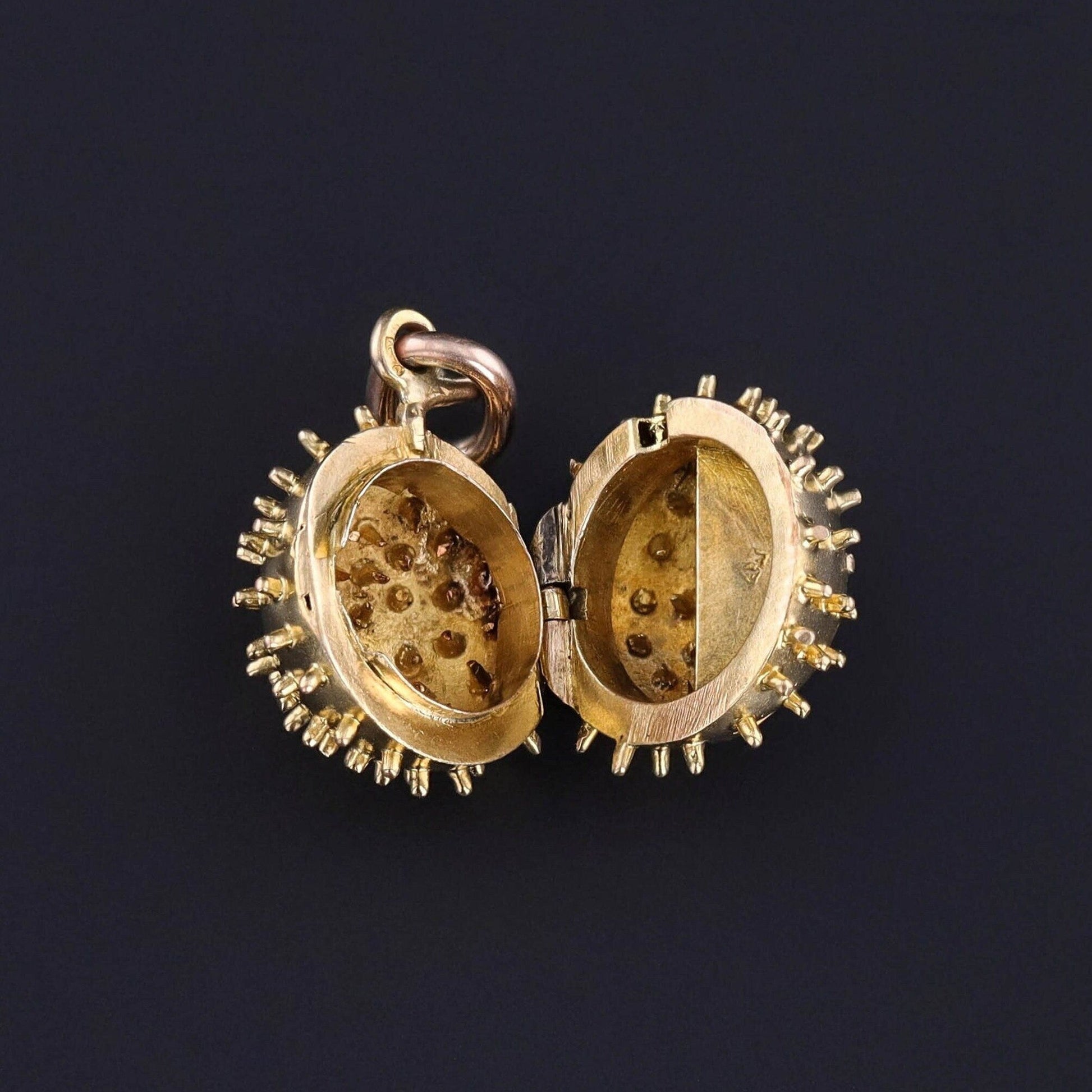 This antique horse chestnut locket dates to the late 1800¡¯s and features a spiked 14k gold shell around a garnet nut.