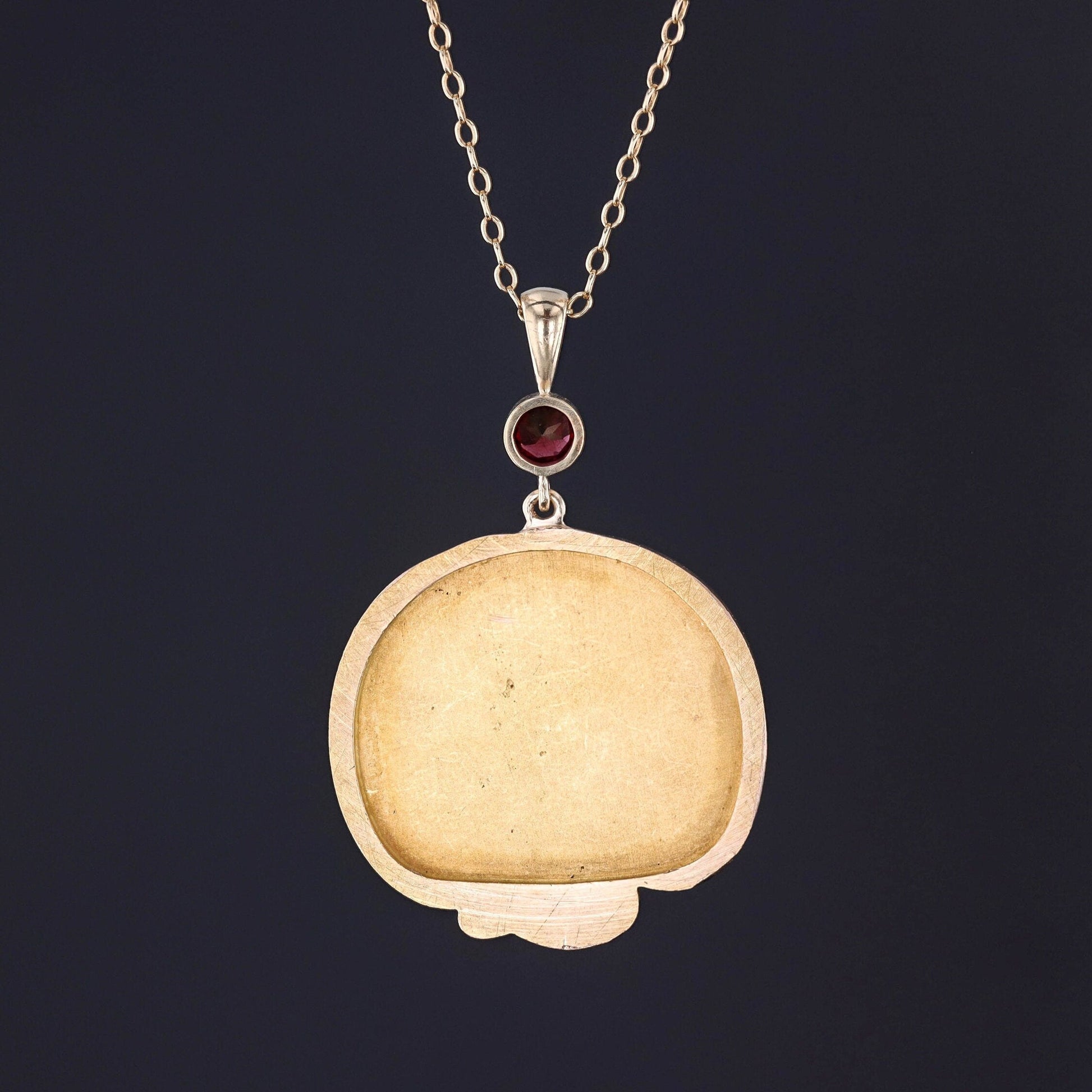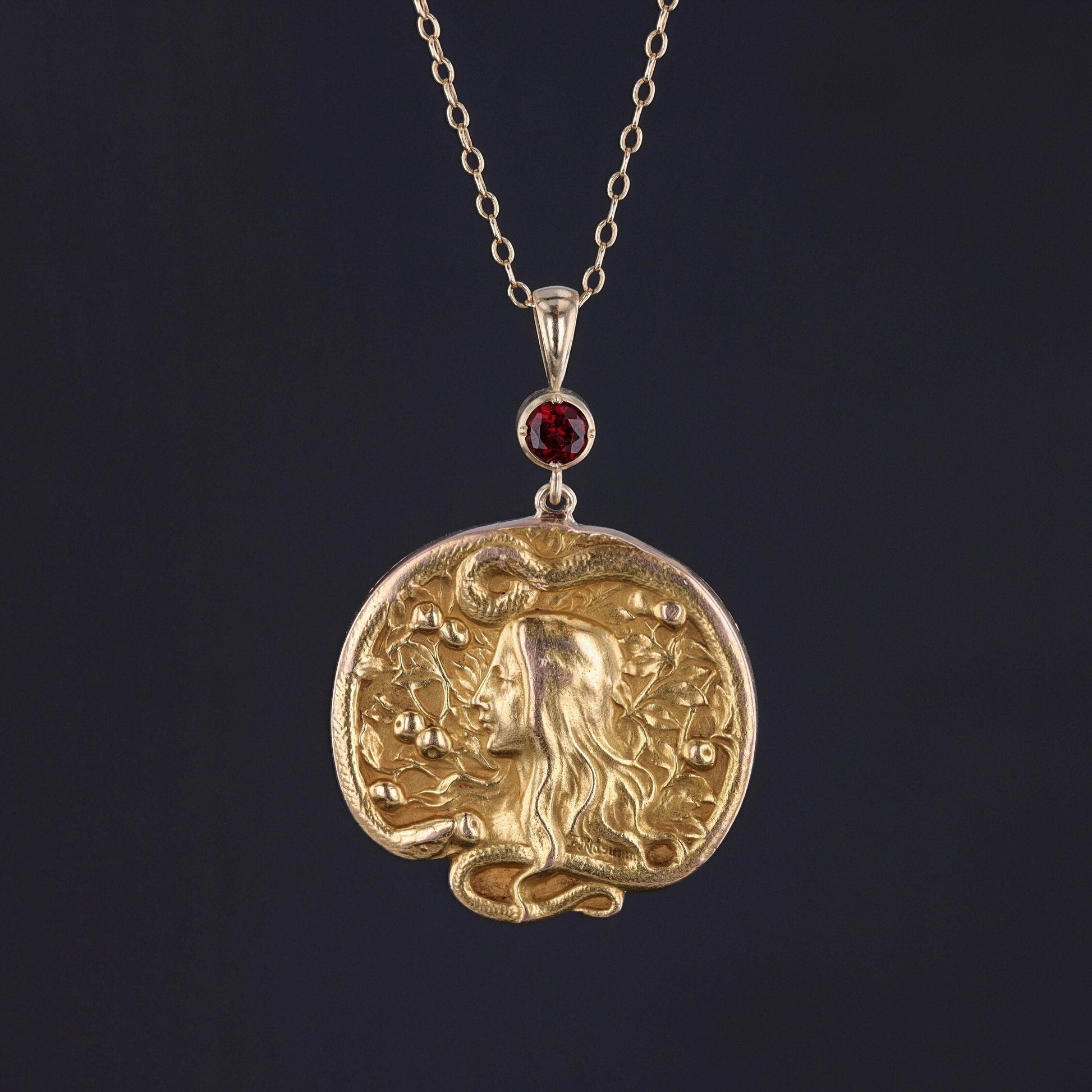 This antique 18k gold pendant (circa 1900) features a depiction of Eve and a snake set against the backdrop of an apple tree. The bail, a later addition, is 14k gold and accented with a garnet.