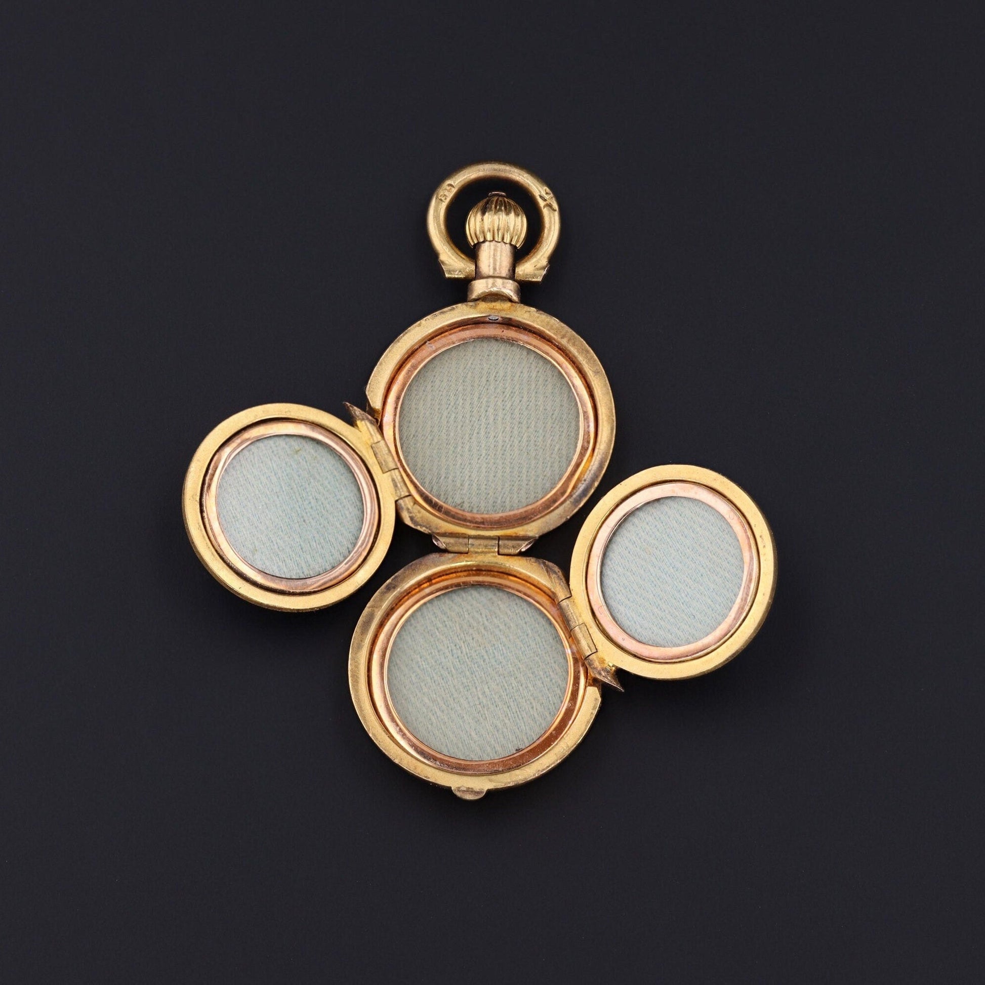 This lovely antique locket (circa 1910) is 14k gold with a simple etched design above a petite cornflower blue sapphire. The locket opens by pulling up on the top circle, exposing four photo frames.