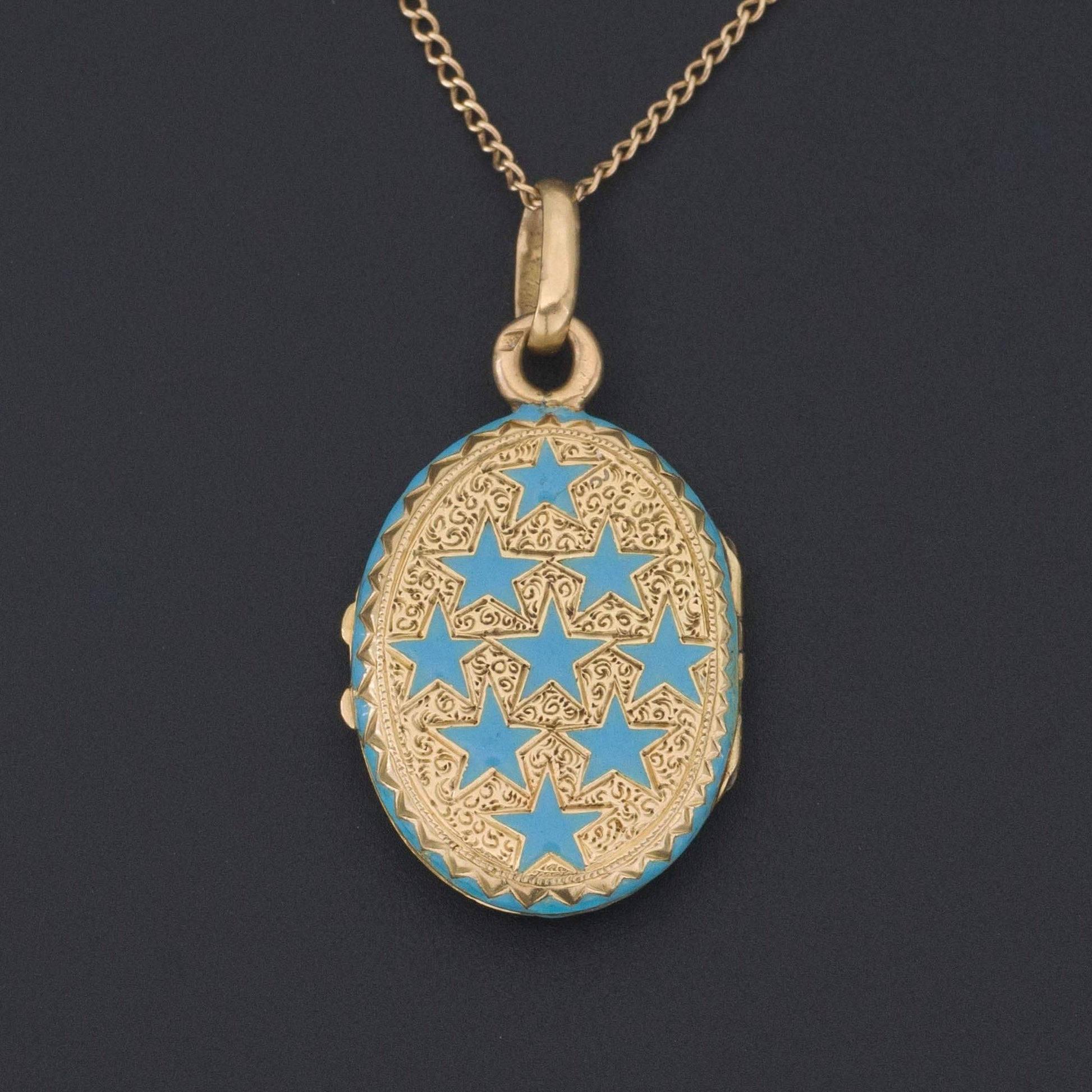This elegant Victorian locket dates to the late 1800s (circa 1870-1890) is 14k gold (unmarked but tested) and accented with vibrant sky blue enamel stars. The locket opens and closes securely and has a fold out photo frame.