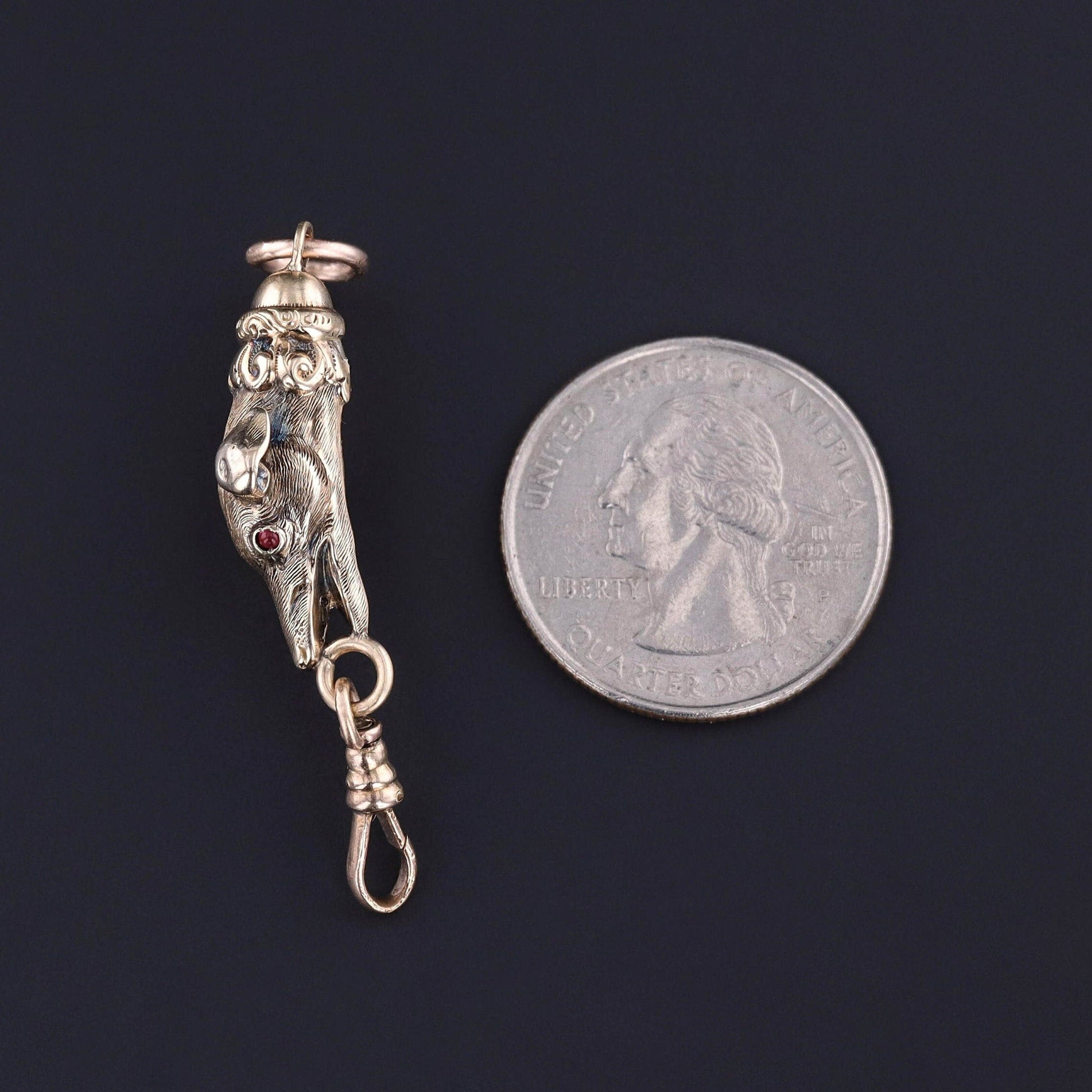 This antique charm holder (circa 1890) features a greyhound dog of pale, 12k gold. The pendant has two pink glass eyes and a swivel clasp that dangles from its mouth.
