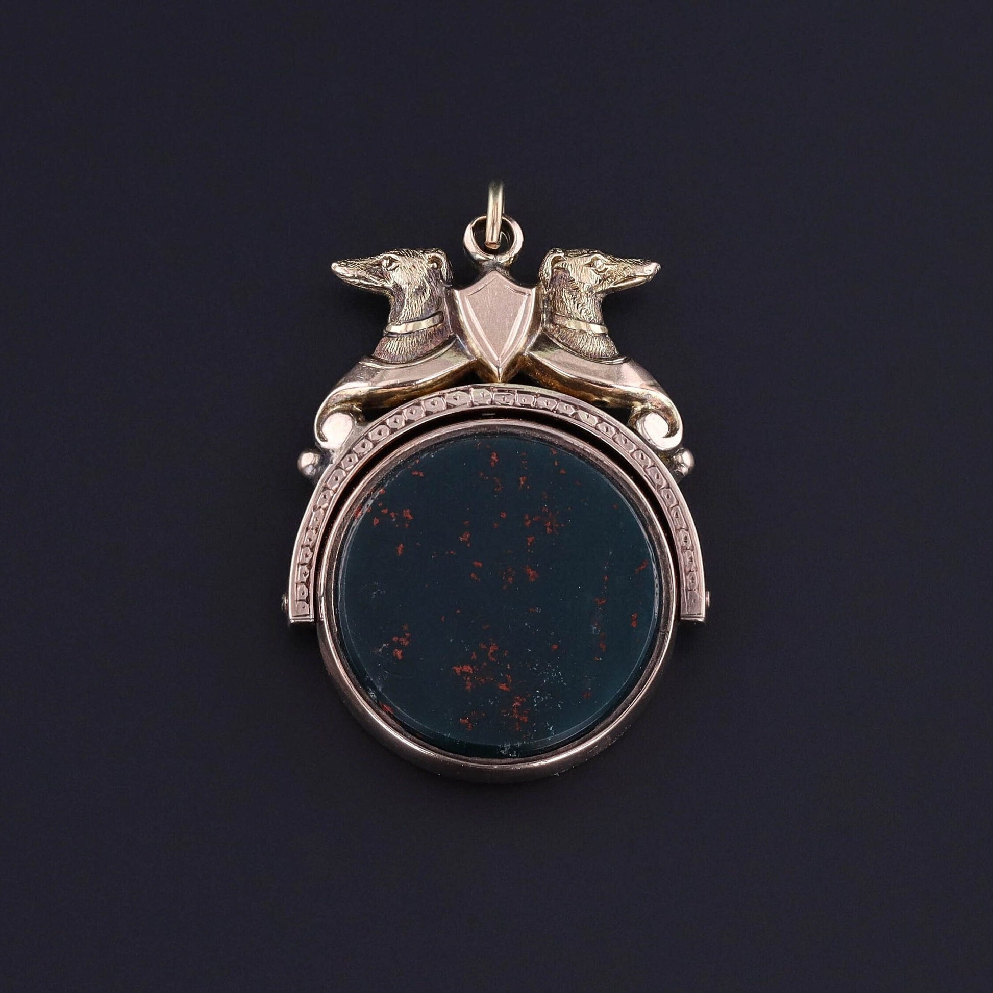 Antique Spinning Fob Pendant: Step into history with this antique fob from the late Victorian era, showcasing two regal greyhounds atop a spinning pendant adorned with bloodstone on one side and carnelian on the other.