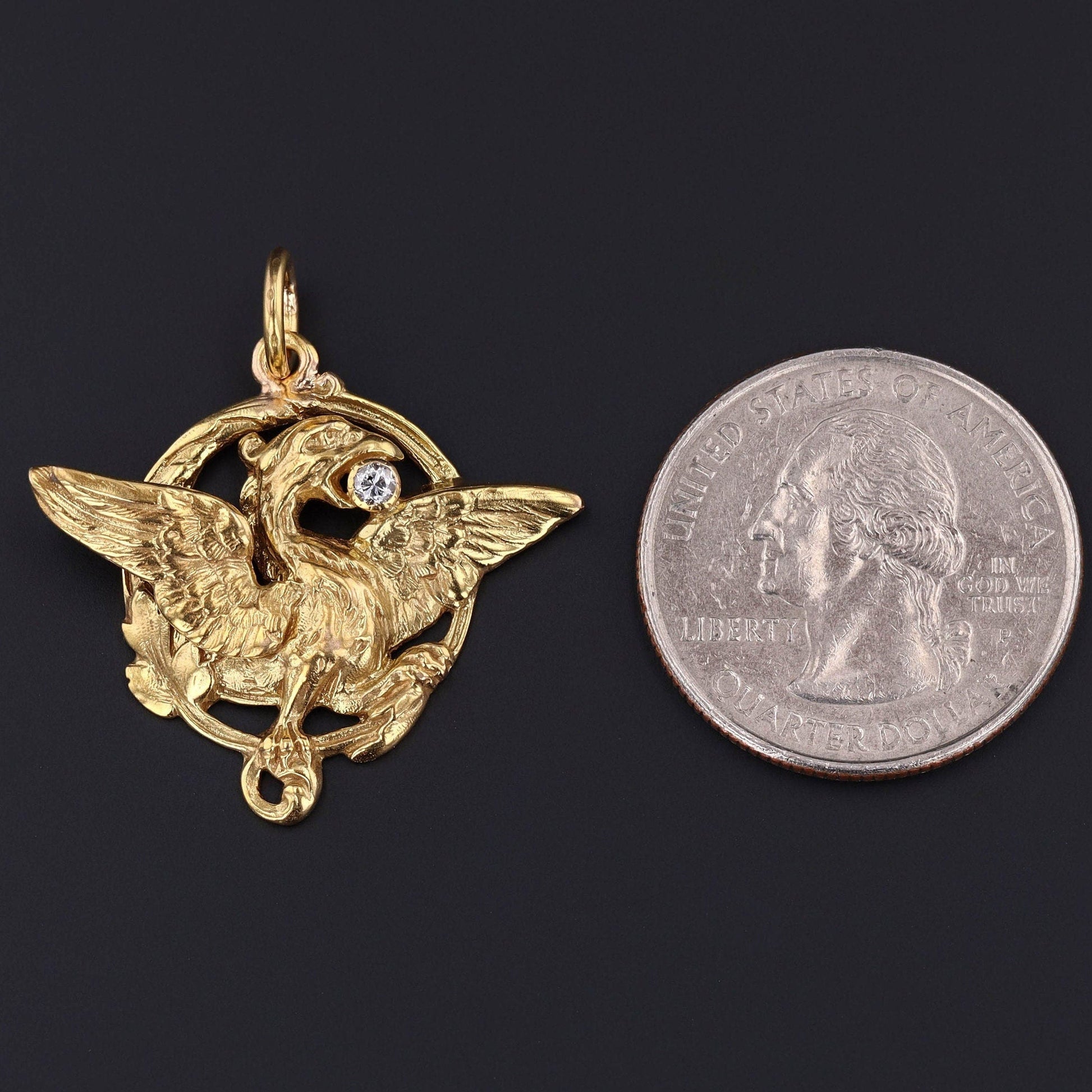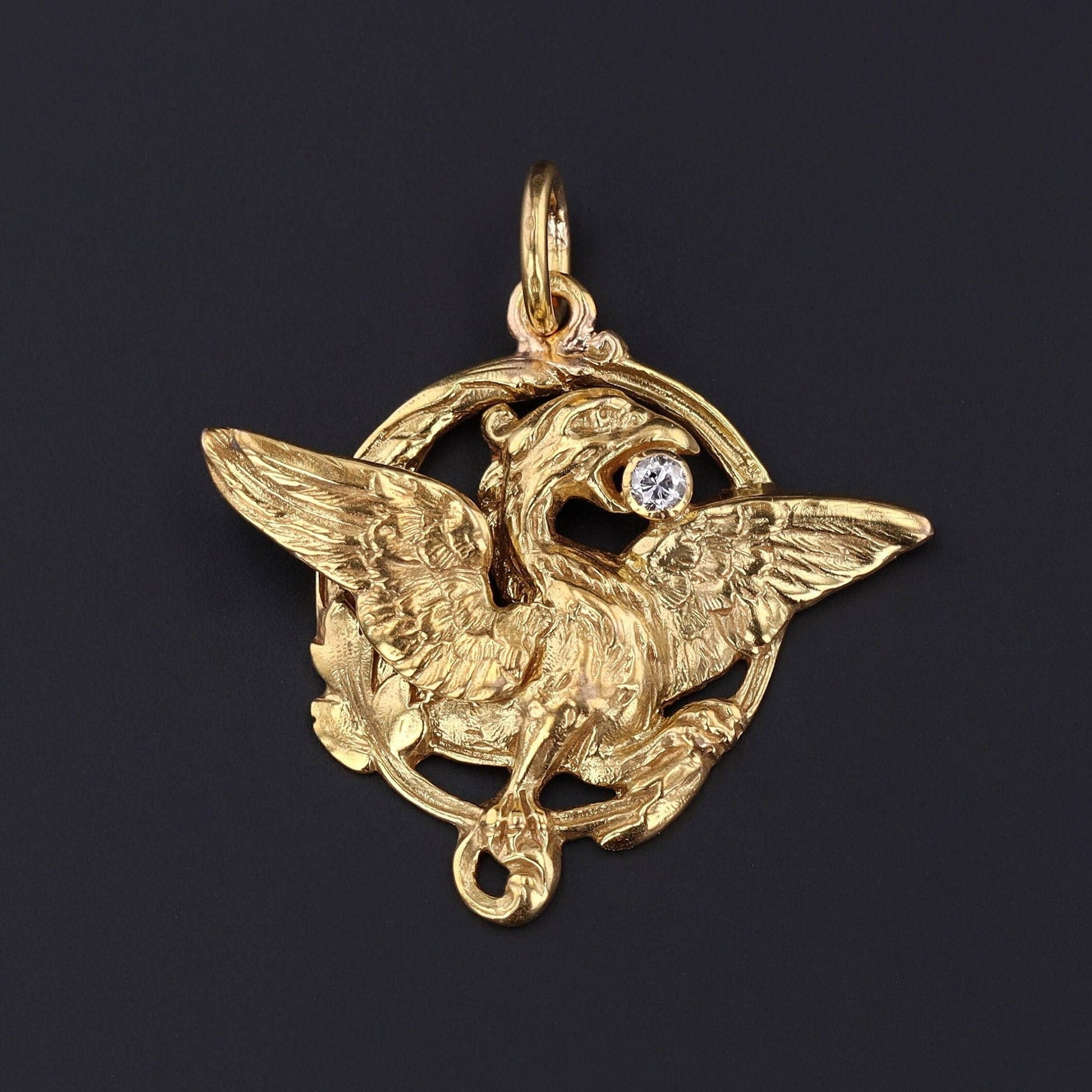 This antique pendant (circa 1900-1920) features a griffin of 14k gold with a single diamond in its mouth.