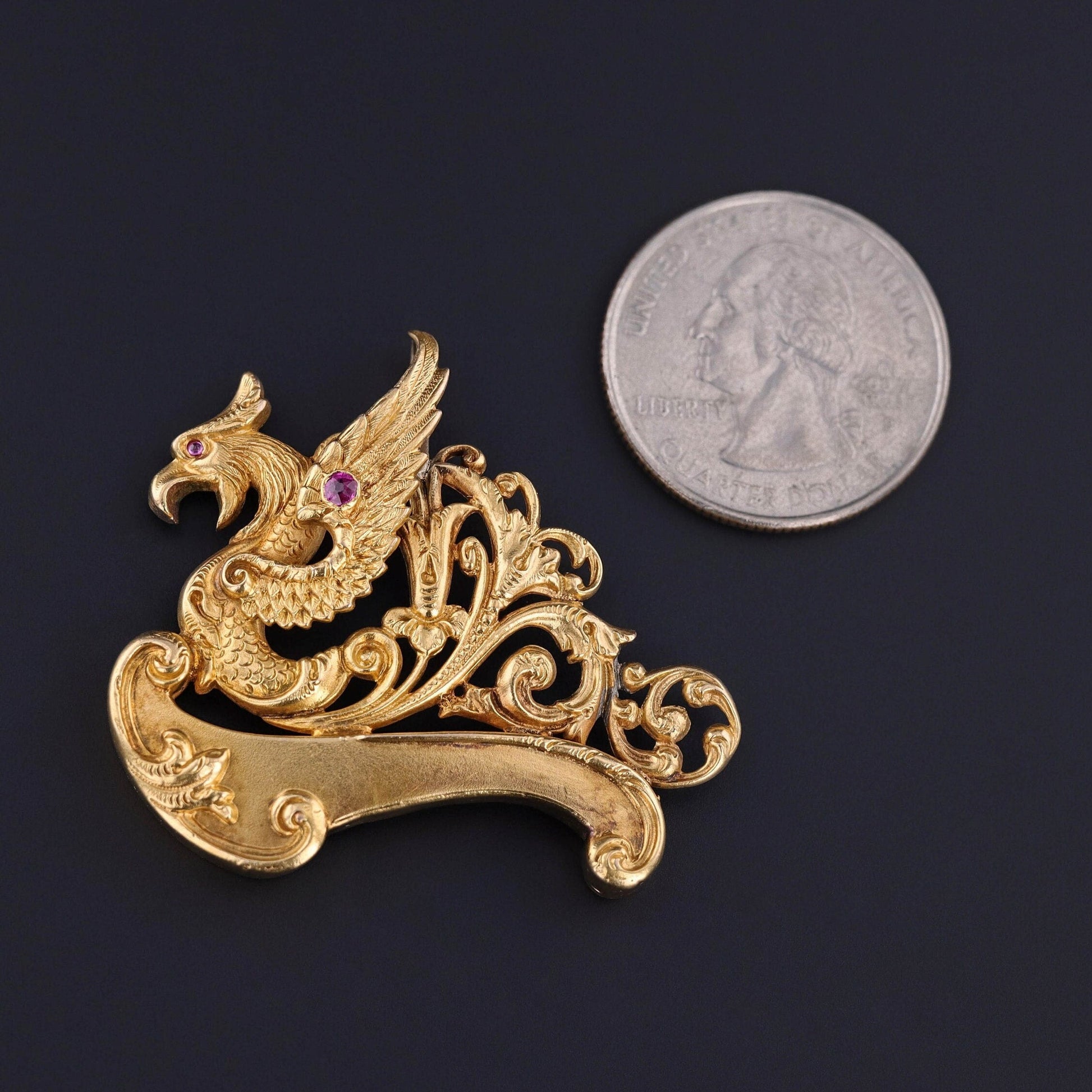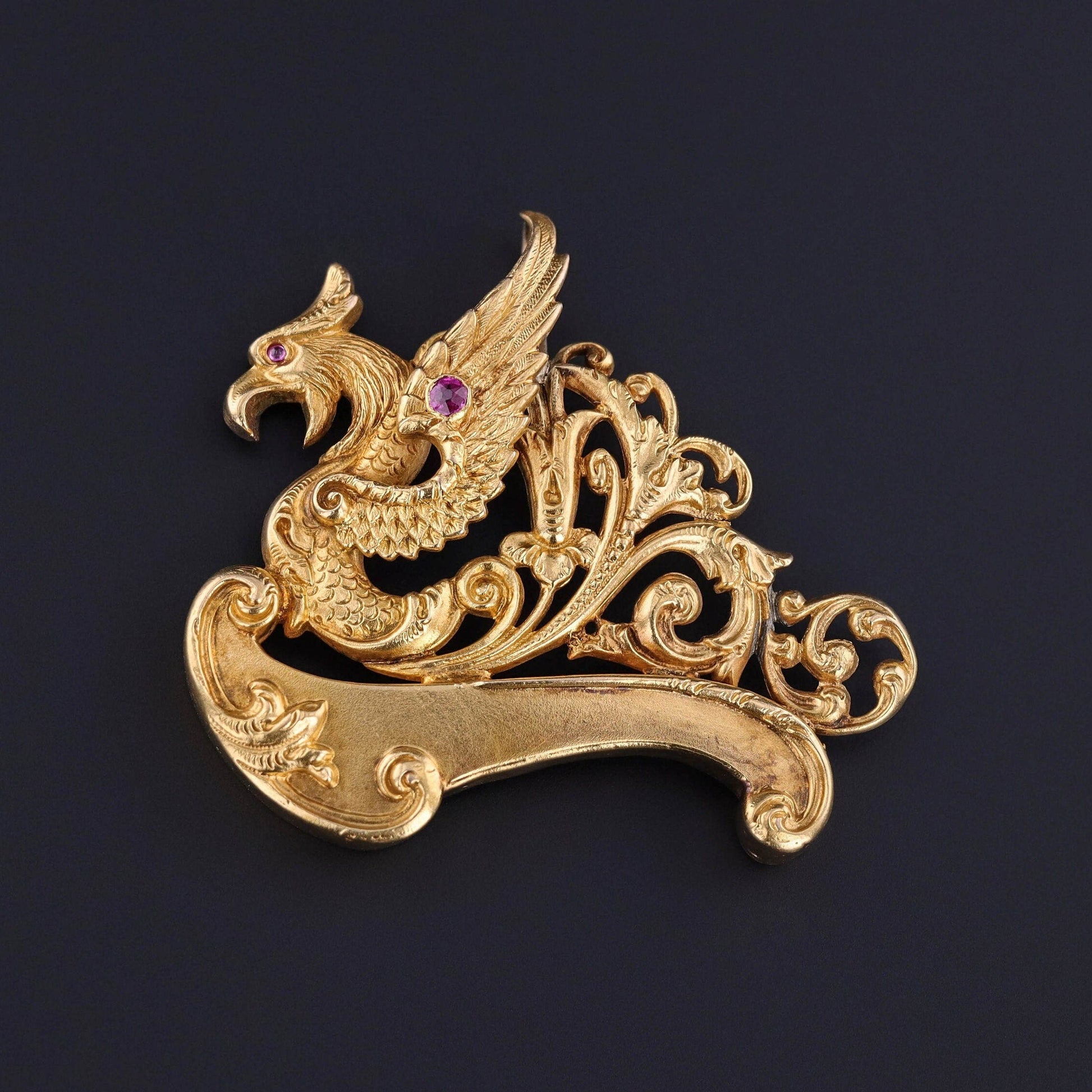 A fine antique pendant depicting a mythical griffin or dragon! The ornate piece is 14k gold and accented with a vibrant pink sapphire.