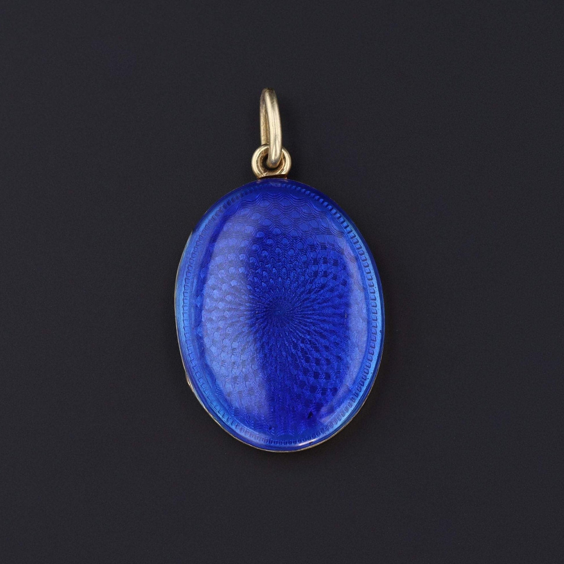 A vibrant blue guilloche enamel locket with old photos still inside!