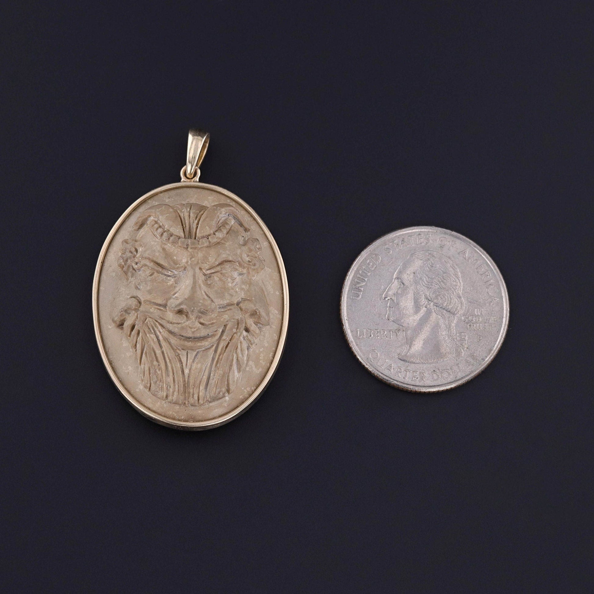 Antique Gryllos Lava Cameo Pendant: Embrace the timeless beauty of this pendant featuring a Gryllos (multi-headed) lava cameo set in 14k gold. The cameo dates to the late Victorian era (circa 1890), but the 14k gold mounting is a new addition to the piece.