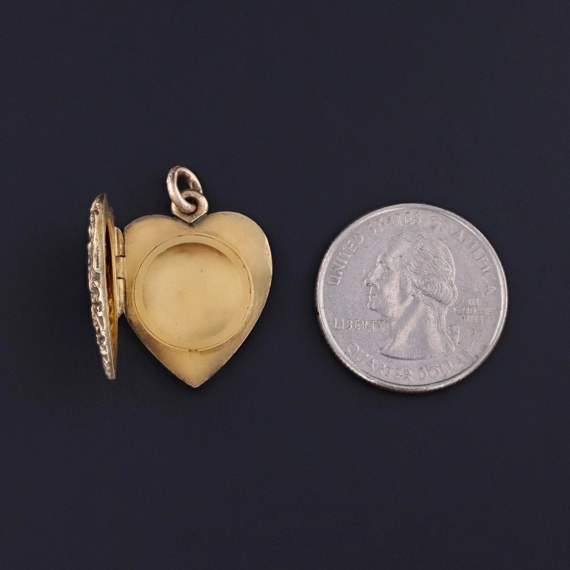 The piece is 14k gold and measures 1.15 inches from the top of the jump ring to bottom by 0.8 inches wide (when closed). It is in great condition.