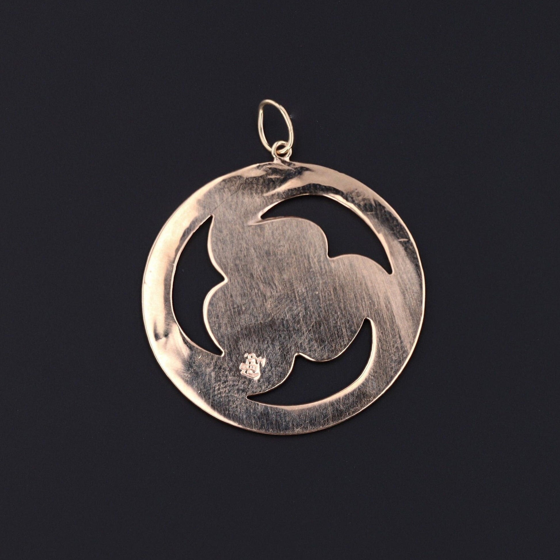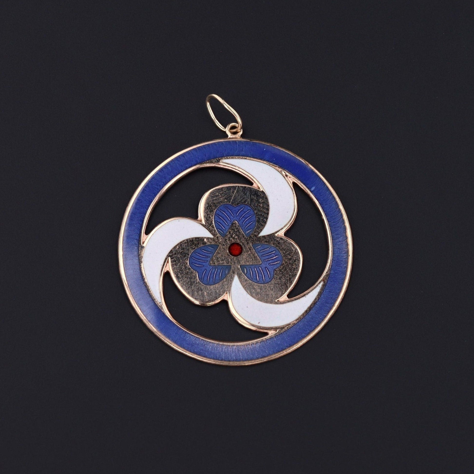 The vintage 10k gold piece (circa 1960-1970) features red white and blue enamel and a trefoil design. It measures 1 inch in diameter and it is in very good condition.