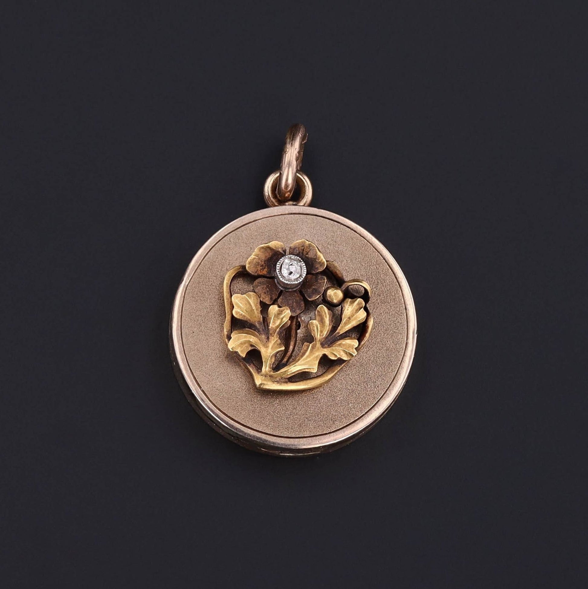 This antique 10k gold locket (circa 1910) is adorned with a flower accented with a tiny diamond.