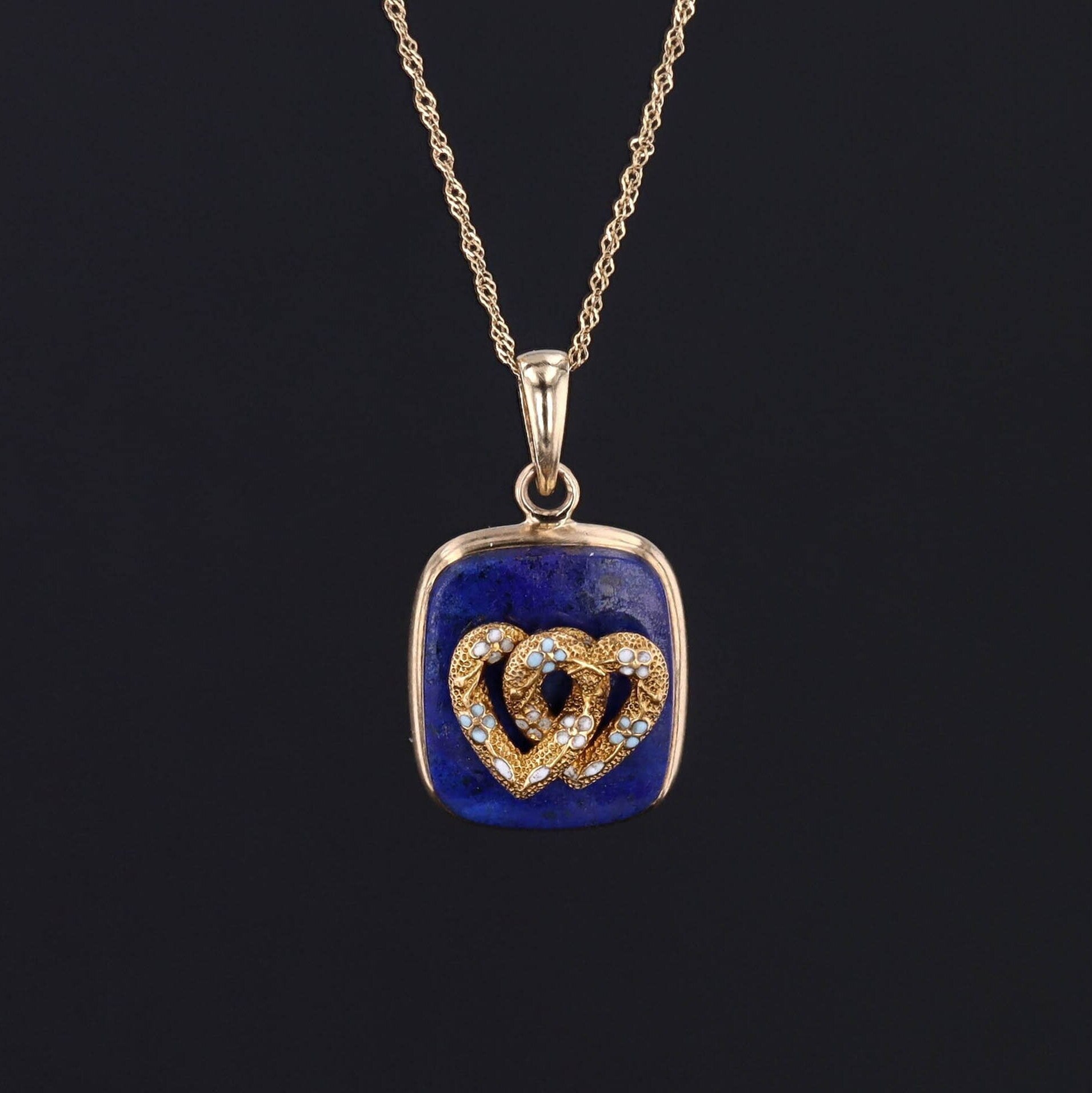 Antique Entwined Hearts Lapis Pendant of 14k Gold