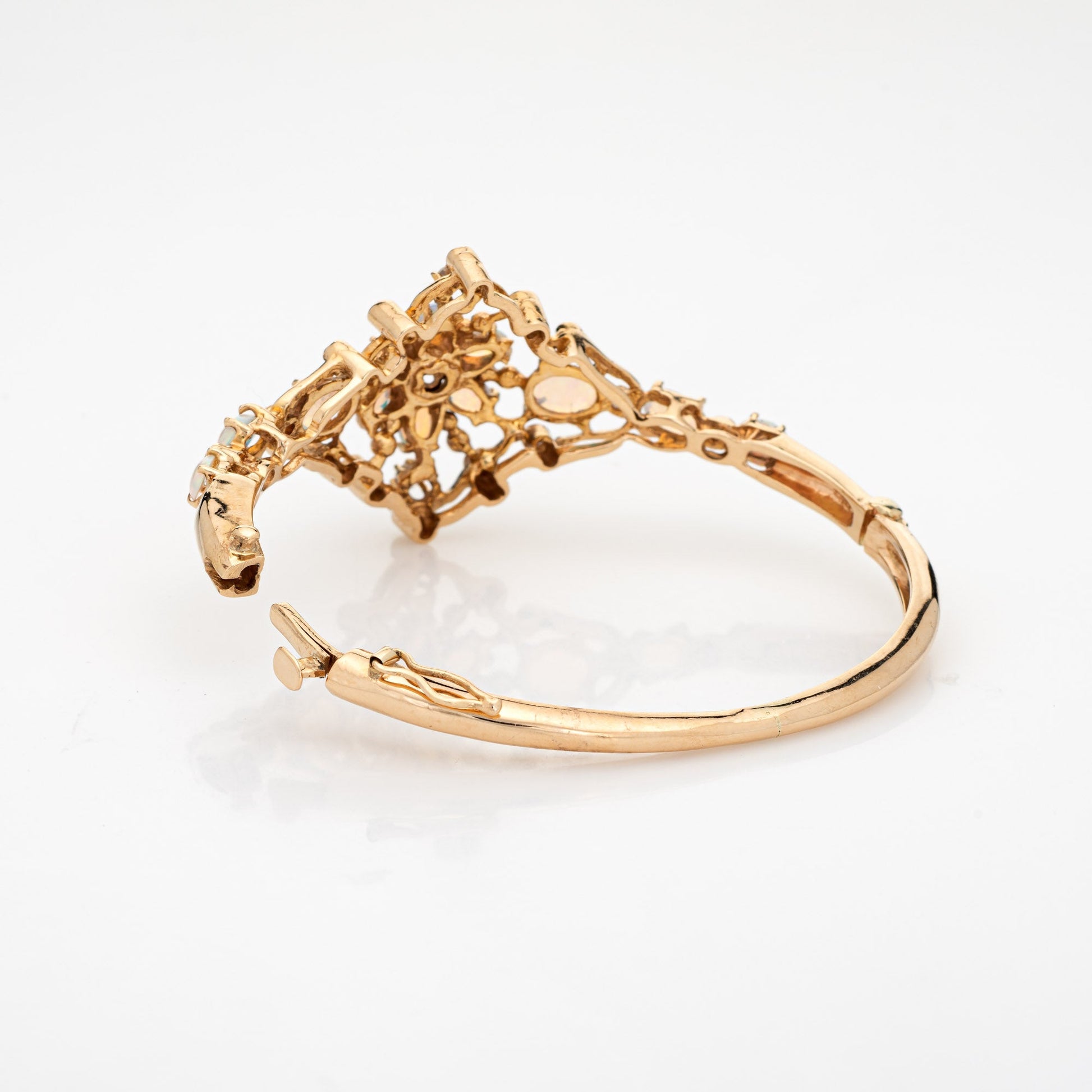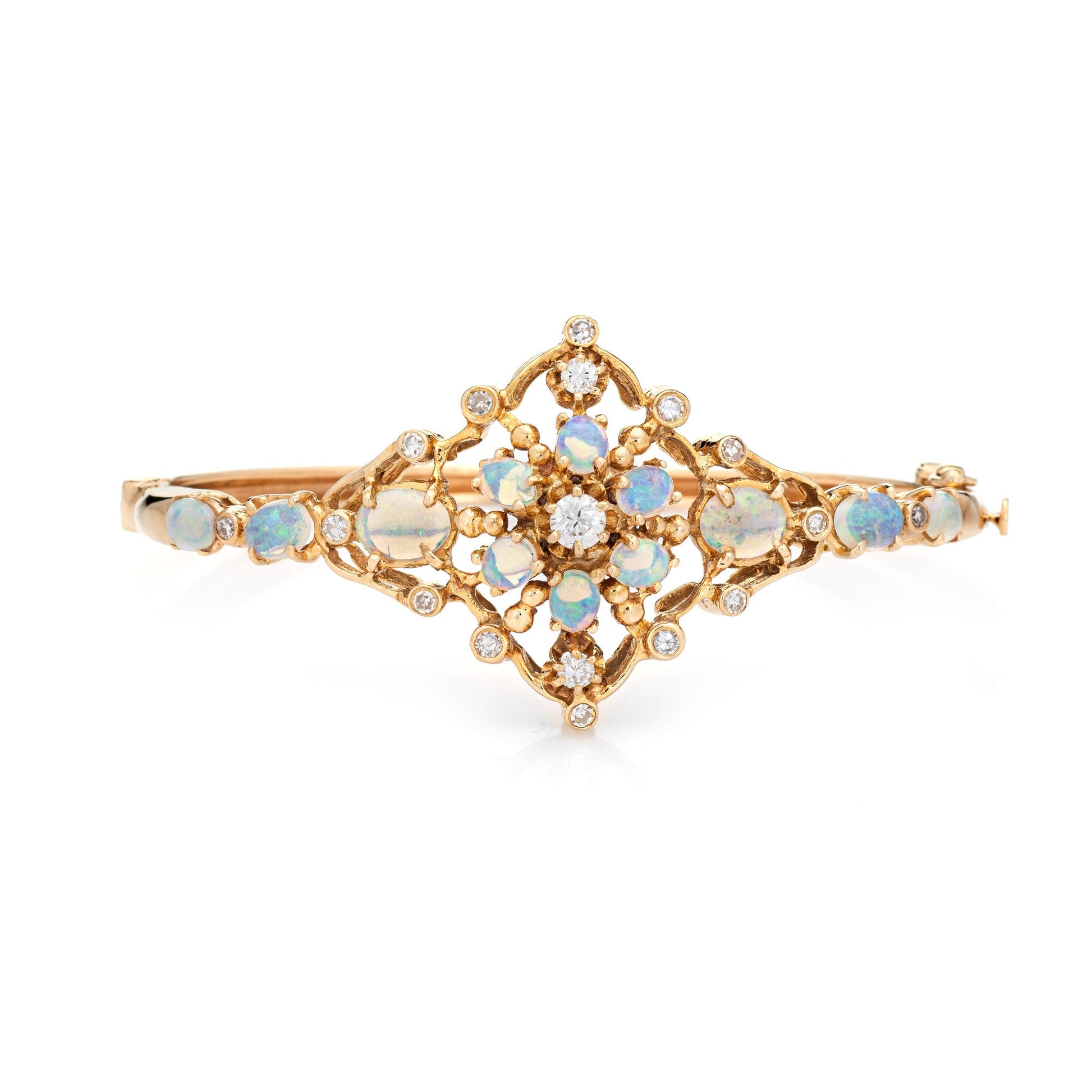 Overview:? Stylish vintage opal & diamond bangle bracelet crafted in 14k yellow gold (circa 1970s to 1980s). Specifications: