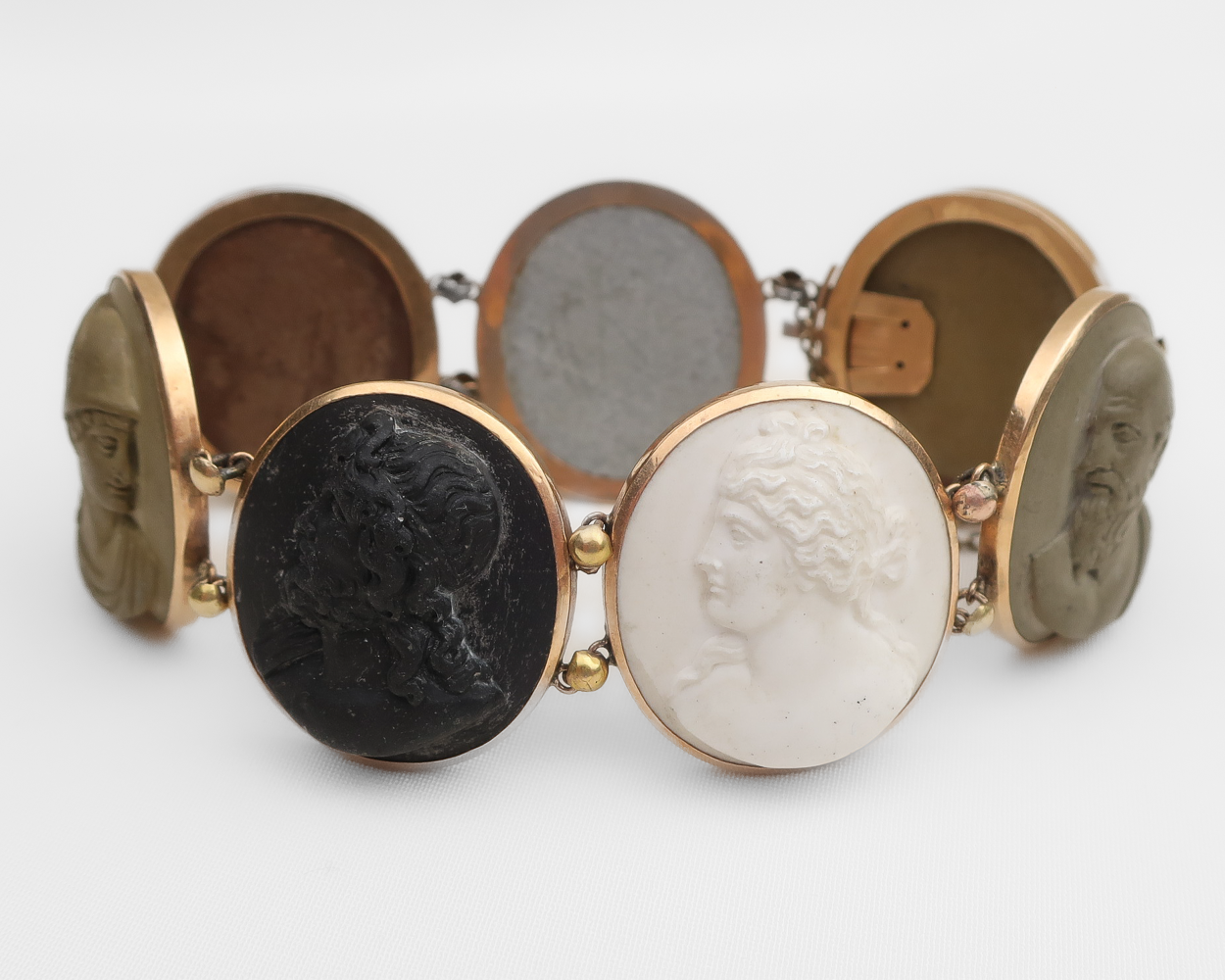Circa 1860. This beautiful Victorian bracelet features seven portrait cameos carved from ash rock and bezel set within a 15KT gold frame. During the Victorian Era, those traveling on a Grand Tour of Europe were fascinated by Pompeii, and lava jewelry sold at the site made excellent souvenirs. Donning the lava jewelry back home identified the wearer as a world traveler and a purveyor of fine culture. The bracelet fits a 7-inch wrist.