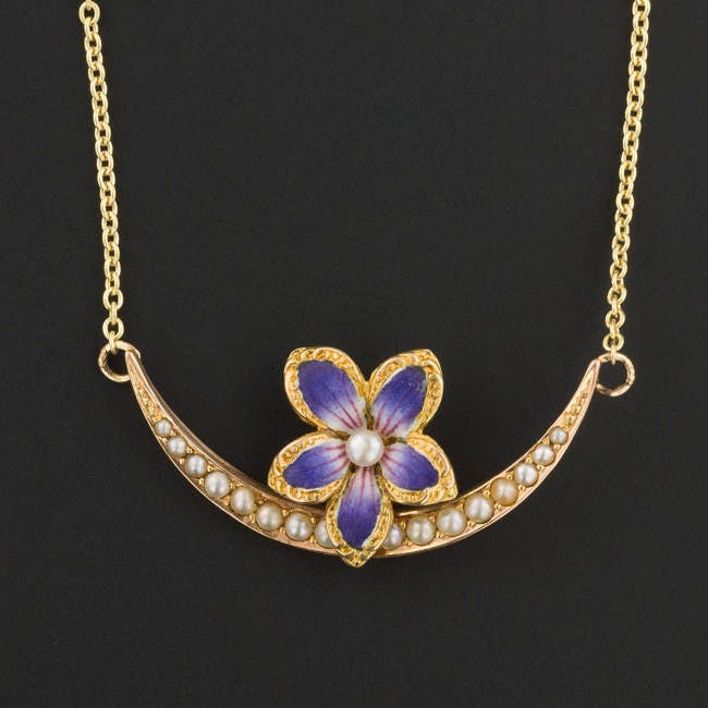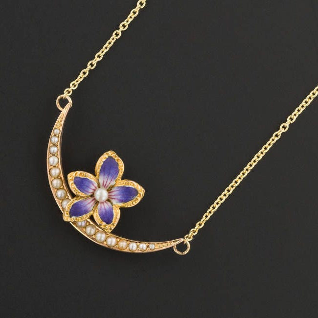 Our jeweler transformed an antique honeymoon pin into an elegant necklace by removing the pin findings from the 14k gold brooch and welding on a new 14k yellow gold chain. The enamel viole is beautifully rendered with a post set pearl and intricate gold border. The crescent is adorned with lustrous half pearls of graduated sizes, and the entire piece is in excellent condition.